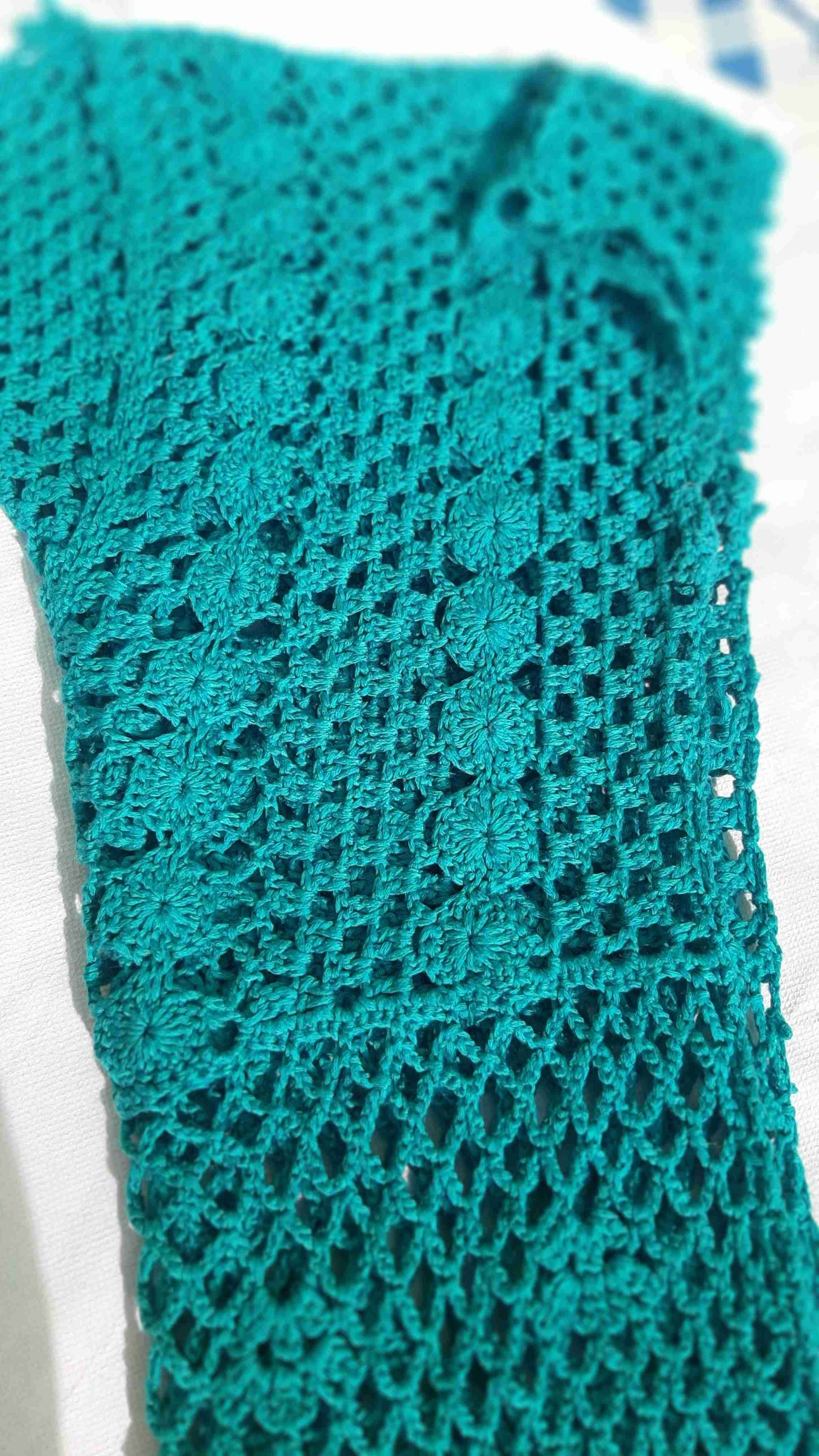 Chal tejido a mano de color turquesa, ideal para días frescos. En buen estado, con patrón calado elegante.