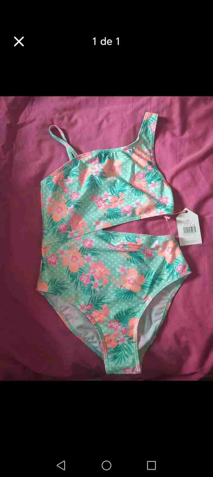 Hermoso traje de baño talla 12 con diseño floral sobre fondo verde. Ideal para un día de piscina o playa. Nuevo con etiqueta.