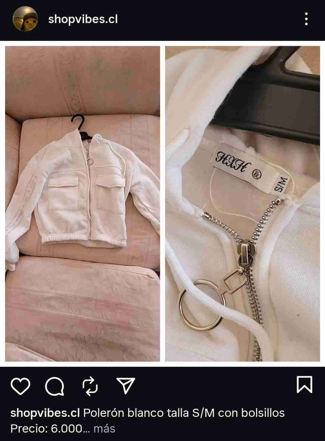 Polerón blanco de talla S/M con cierre delantero y bolsillos. Ideal para el día a día. En buen estado.