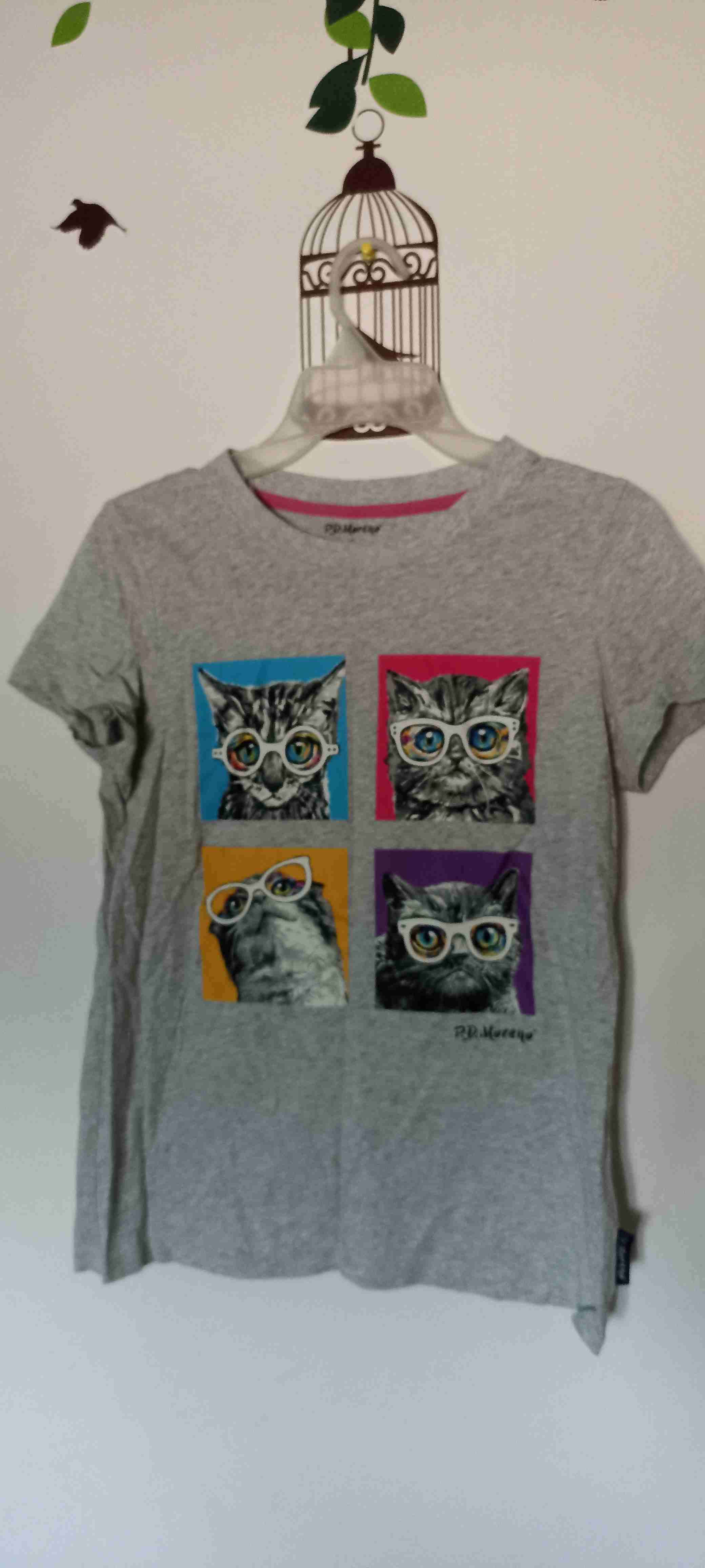 Polera gris con estampado de gatos coloridos. Ideal para un look casual y cómodo, estado en buenas condiciones.