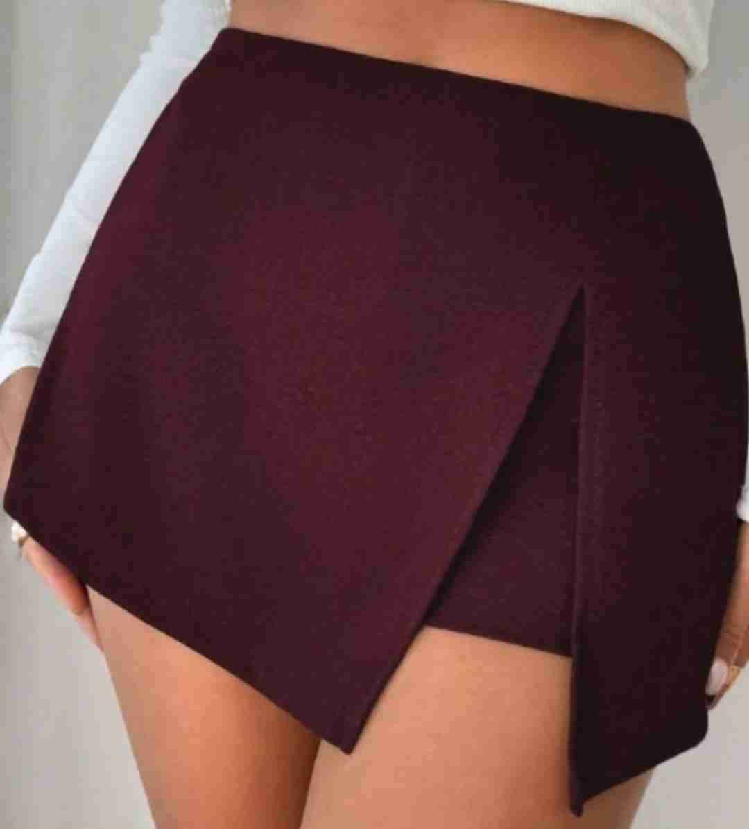 Falda short corta en tono burdeo, ideal para ocasiones formales o casuales. Diseño moderno con abertura lateral. De poliester/elastano, nueva sin etiqueta, talla M