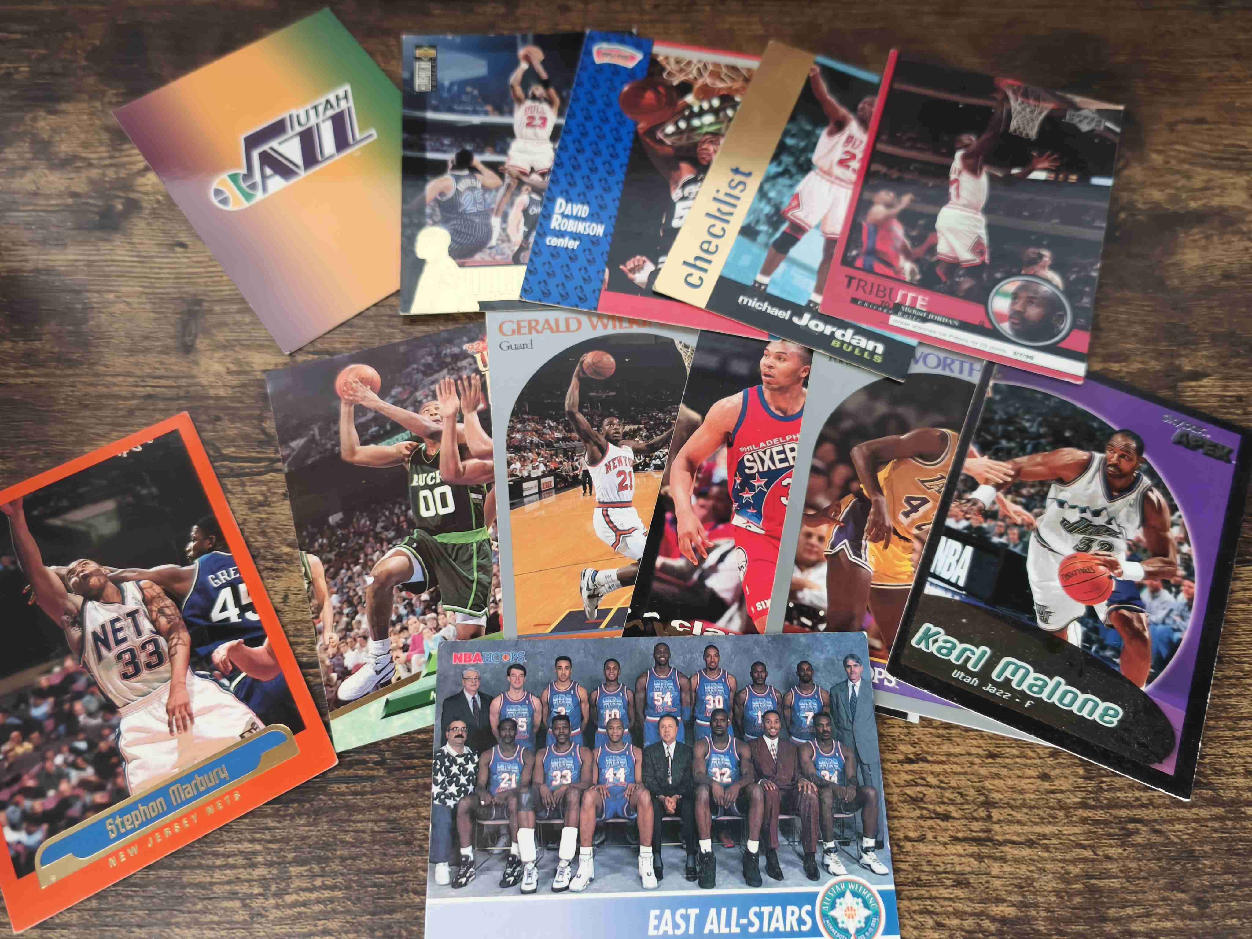 Set de tarjetas coleccionables de NBA, ideal para fanáticos del básquetbol. En buen estado general con algunos signos de uso. Aproximadamente 30 tarjetas.