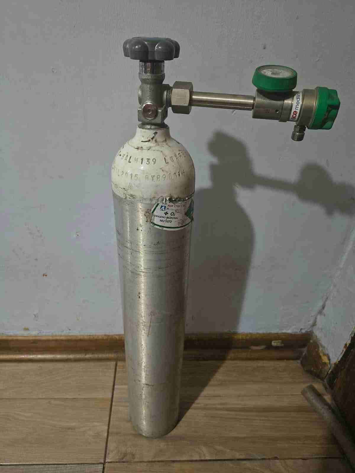 Cilindro metálico de oxígeno en buen estado, incluye regulador. Ideal para emergencias o uso doméstico.