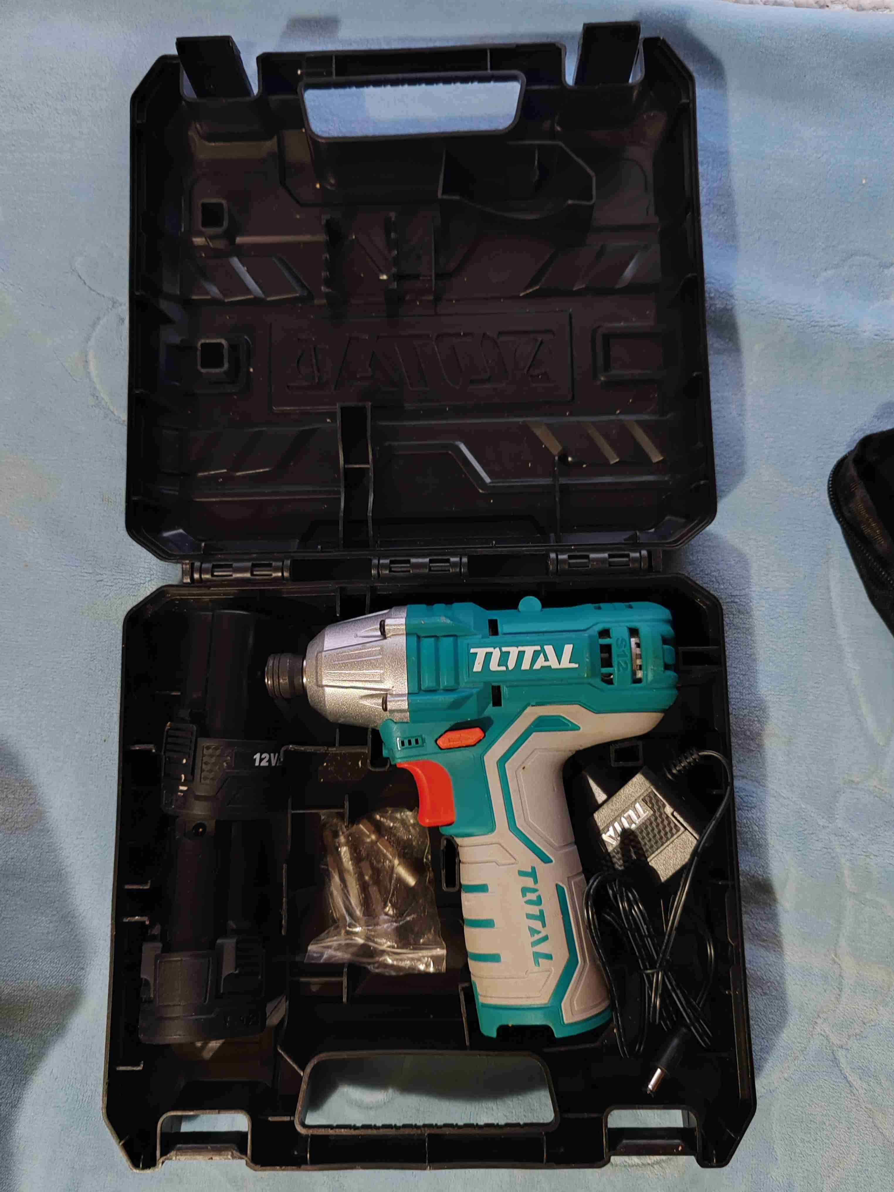 Taladro atornillador inalámbrico Total de 12V en buen estado, ideal para trabajos de bricolaje. Incluye estuche y cargador.