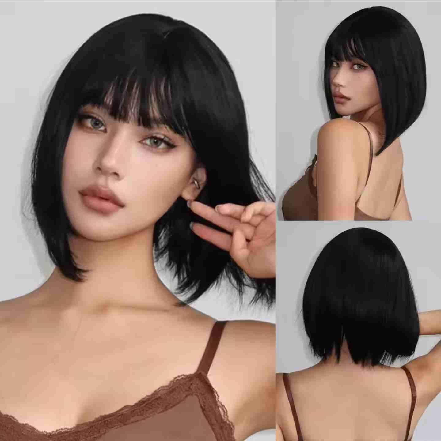 Peluca corta estilo bob en color negro, ideal para cambios de look o disfraces. En buen estado, sin signos de uso evidente.
