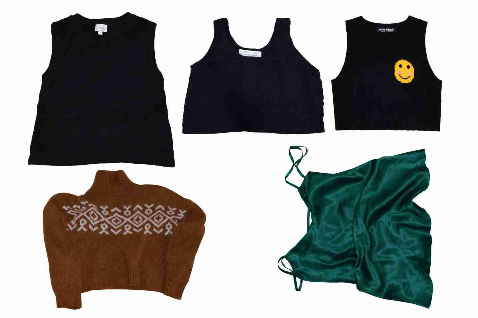 Conjunto de poleras sin mangas y crop top, perfecto para combinar. Incluye un chaleco tejido para clima fresco. Estado general bueno, ideal para uso casual. 1000 cada uno