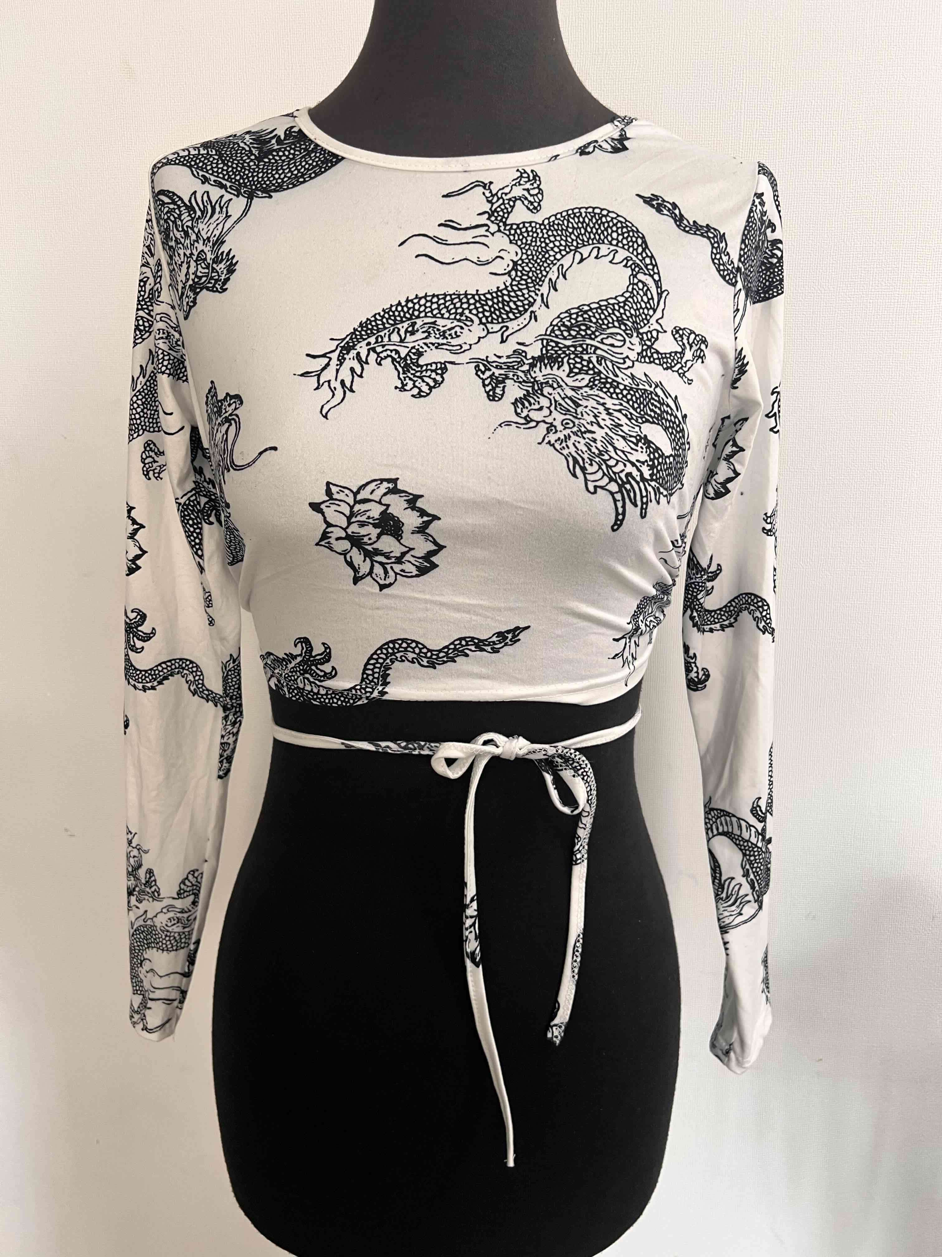 Polera blanca con estampado de dragones en negro, estilo ajustado y manga larga. Perfecta para un look casual y moderno.