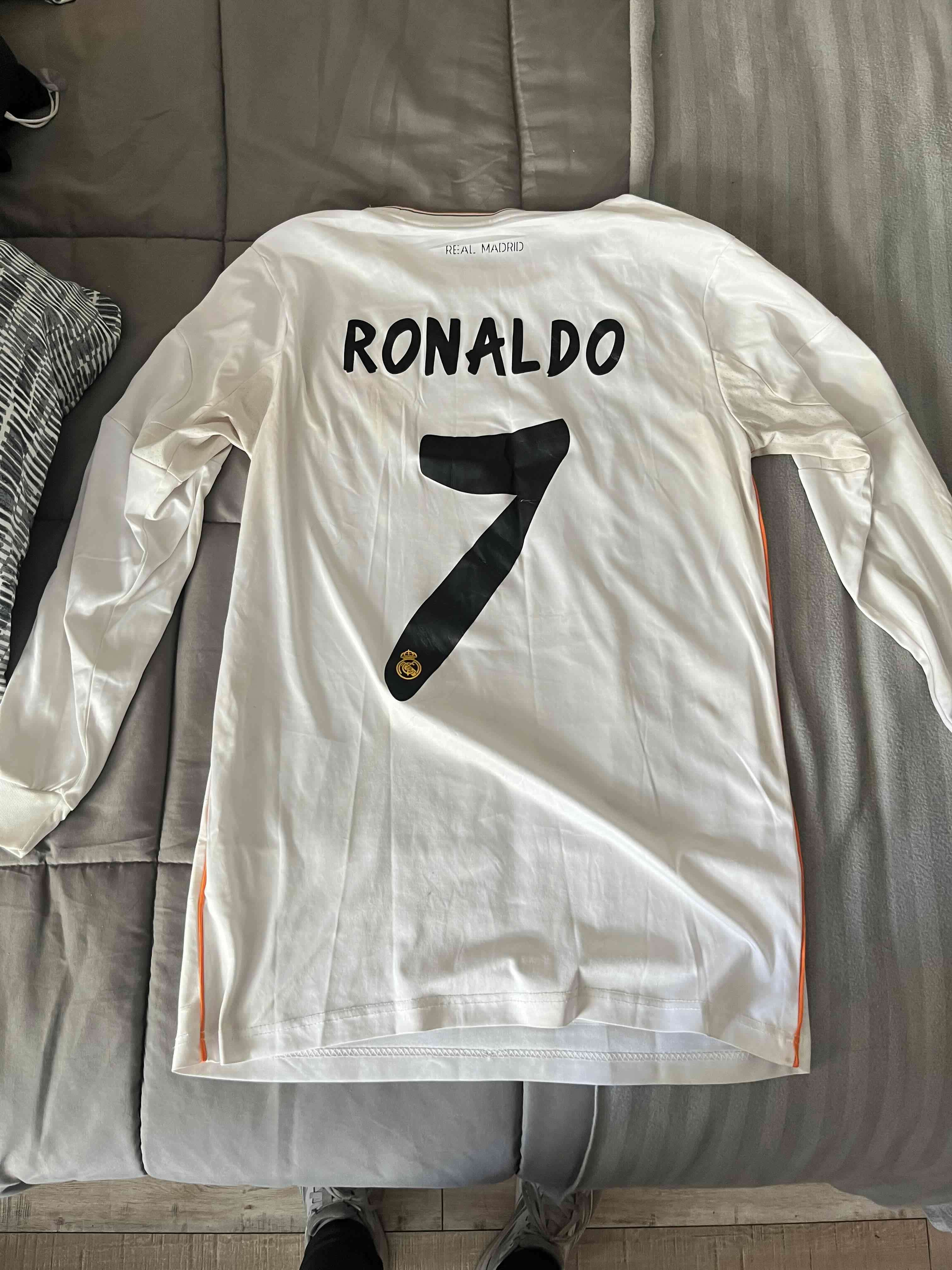 Camiseta blanca de manga larga del Real Madrid , numero cristiano Ronaldo , final Lisboa 2014