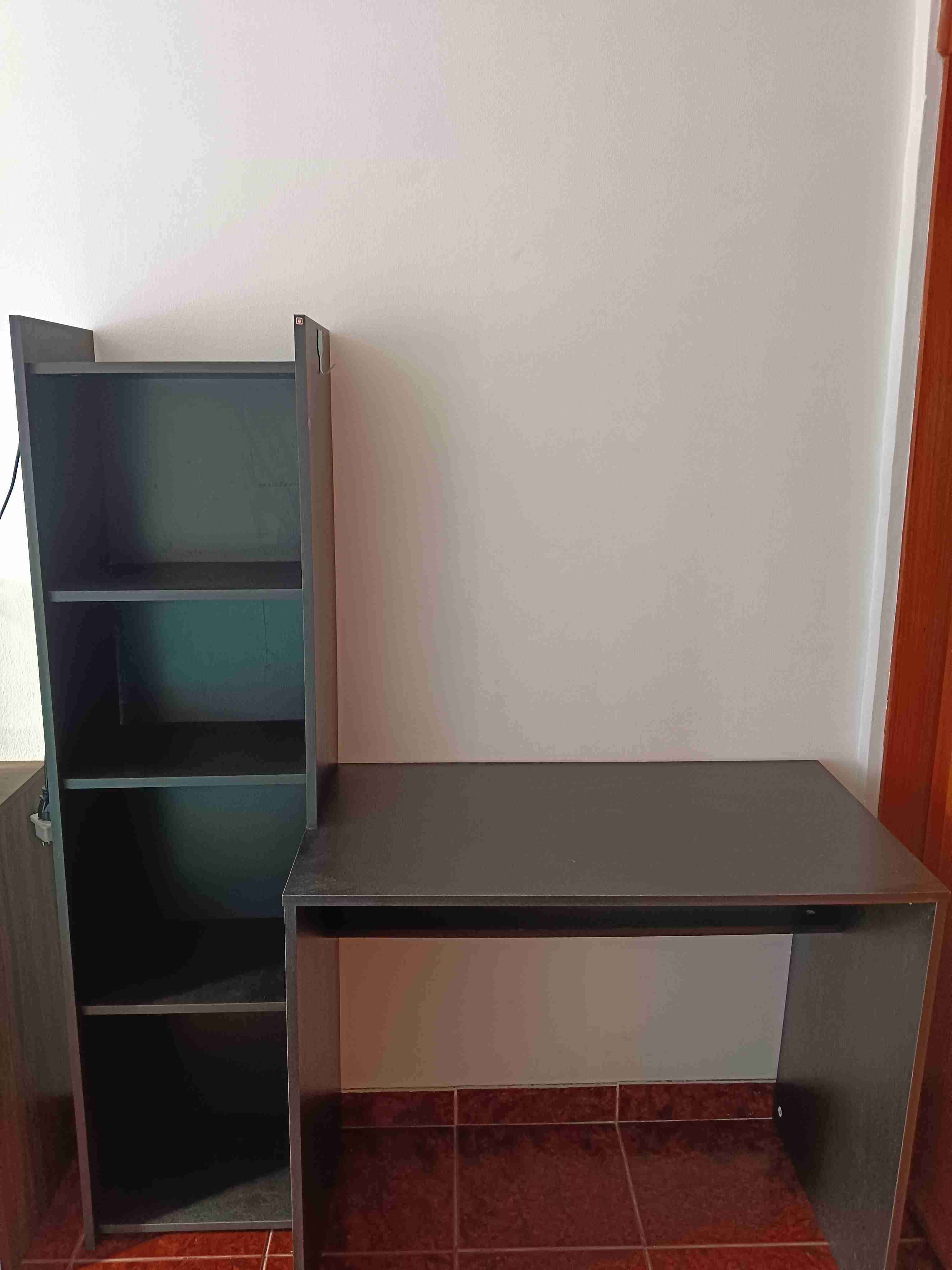 Escritorio moderno color negro con estantería lateral de tres niveles. Ideal para oficina o estudio en casa. En buen estado general.