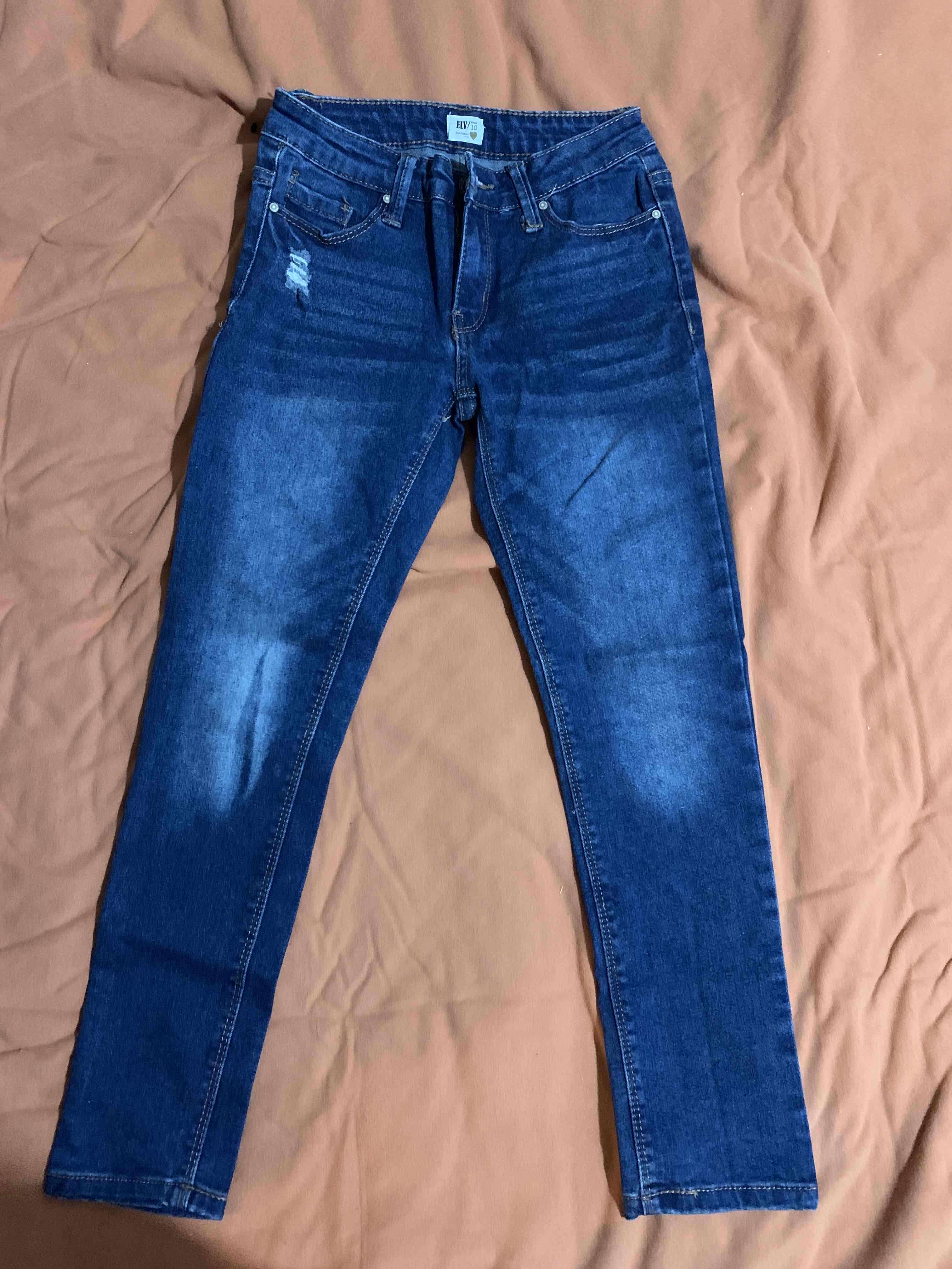 Jeans en buen estado general, color azul con leves desgastes en la parte frontal. Perfectos para un look casual y relajado. Talla 10