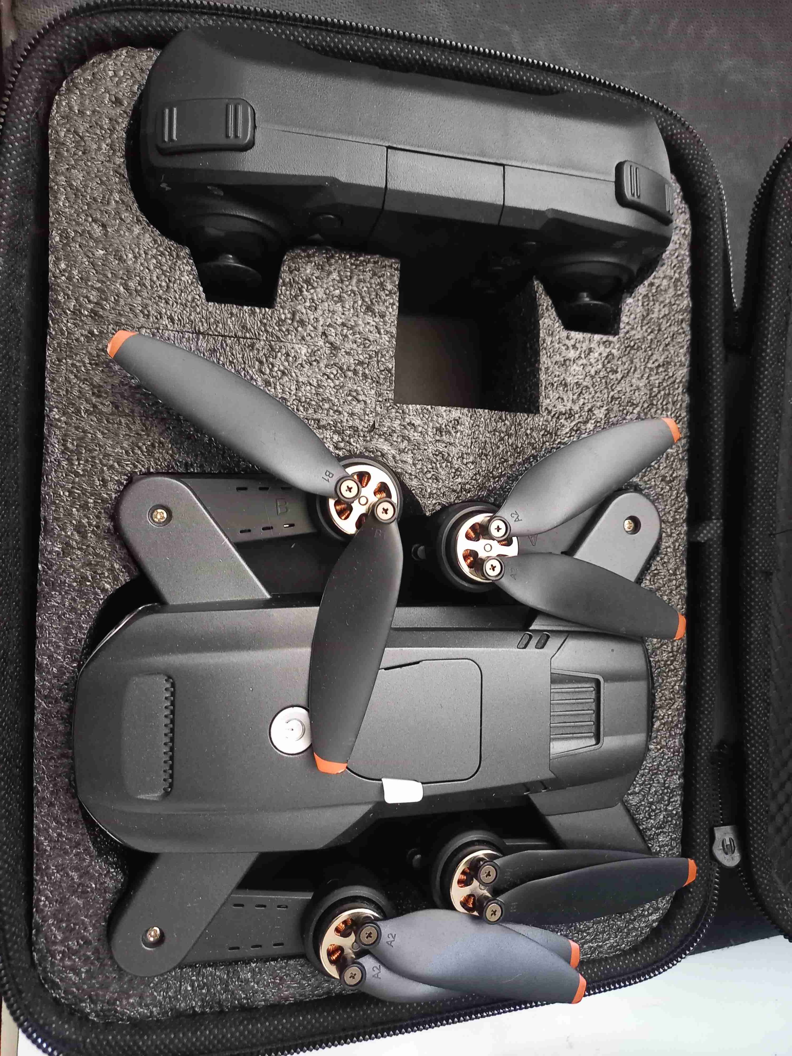 Drone compacto con hélices plegables, ideal para capturar imágenes aéreas. Incluye control remoto y estuche protector.