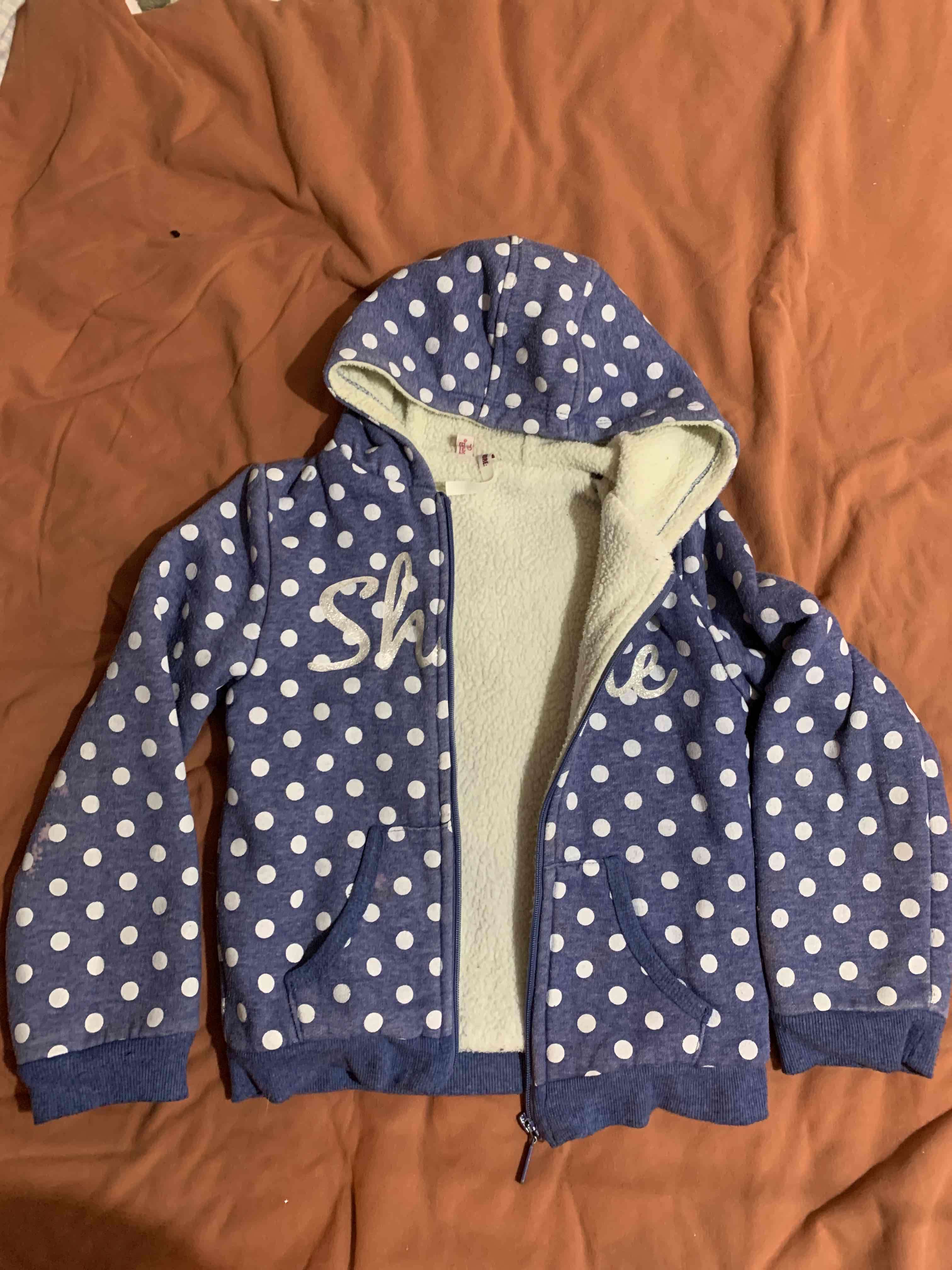 Polerón con capucha azul de lunares blancos, ideal para días fríos ya que por dentro es dorado tipo corderito. En buen estado.