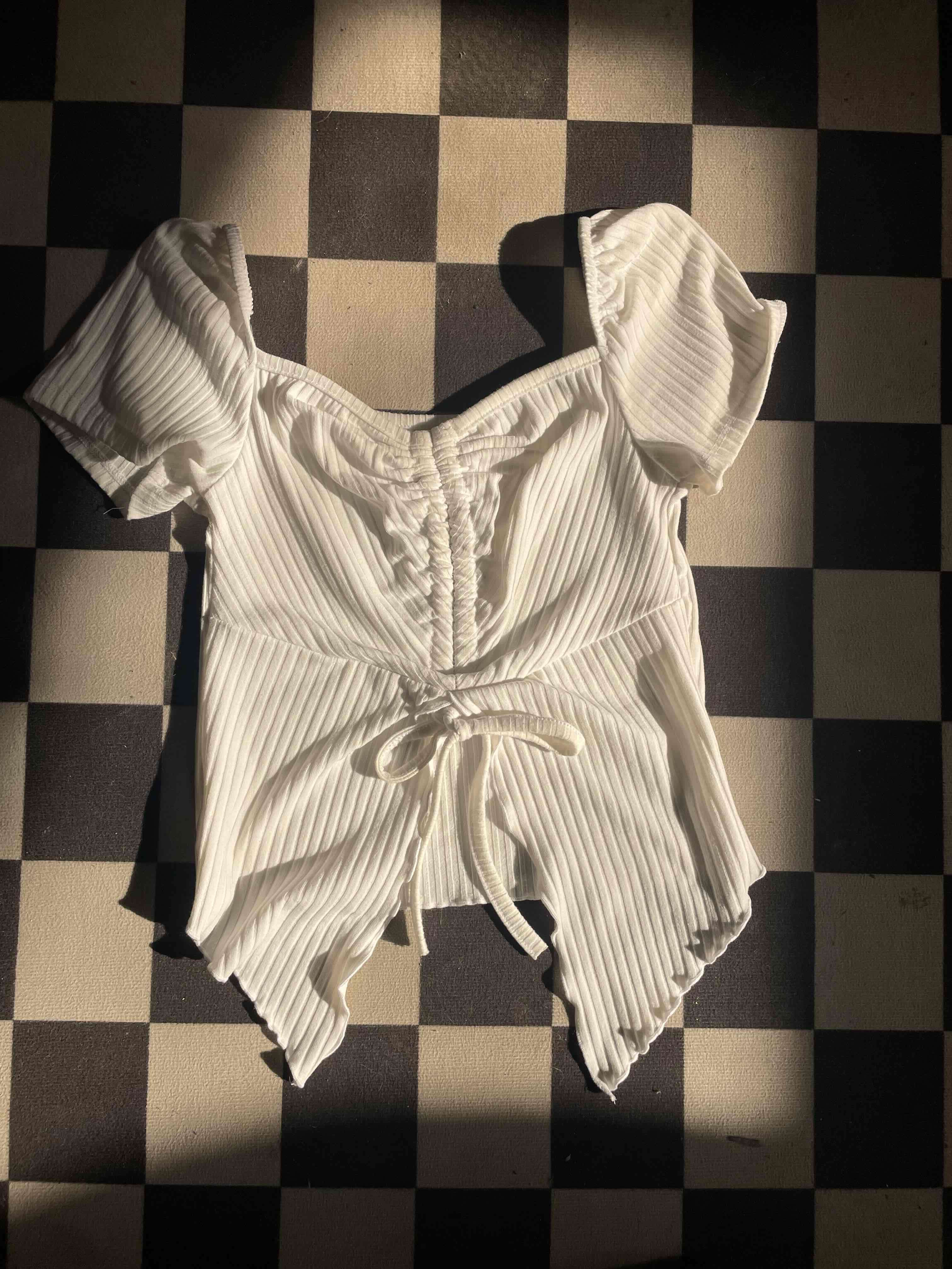 Blusa blanca de tela acanalada, con mangas cortas y ajuste delantero. Ideal para un look casual .