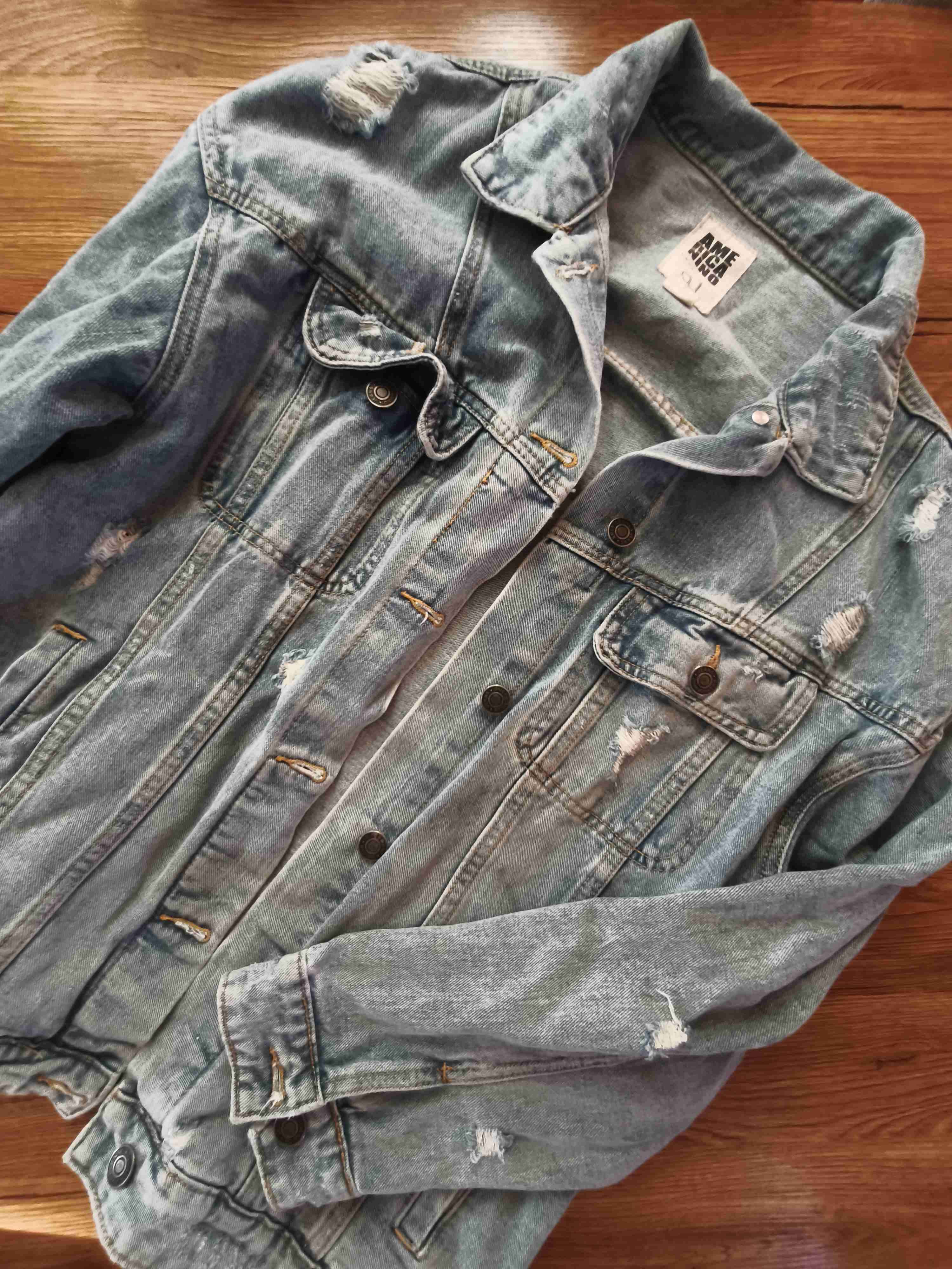 Chaqueta Americanino de mezclilla azul con estilo desgastado. Ideal para un look casual. En buen estado.