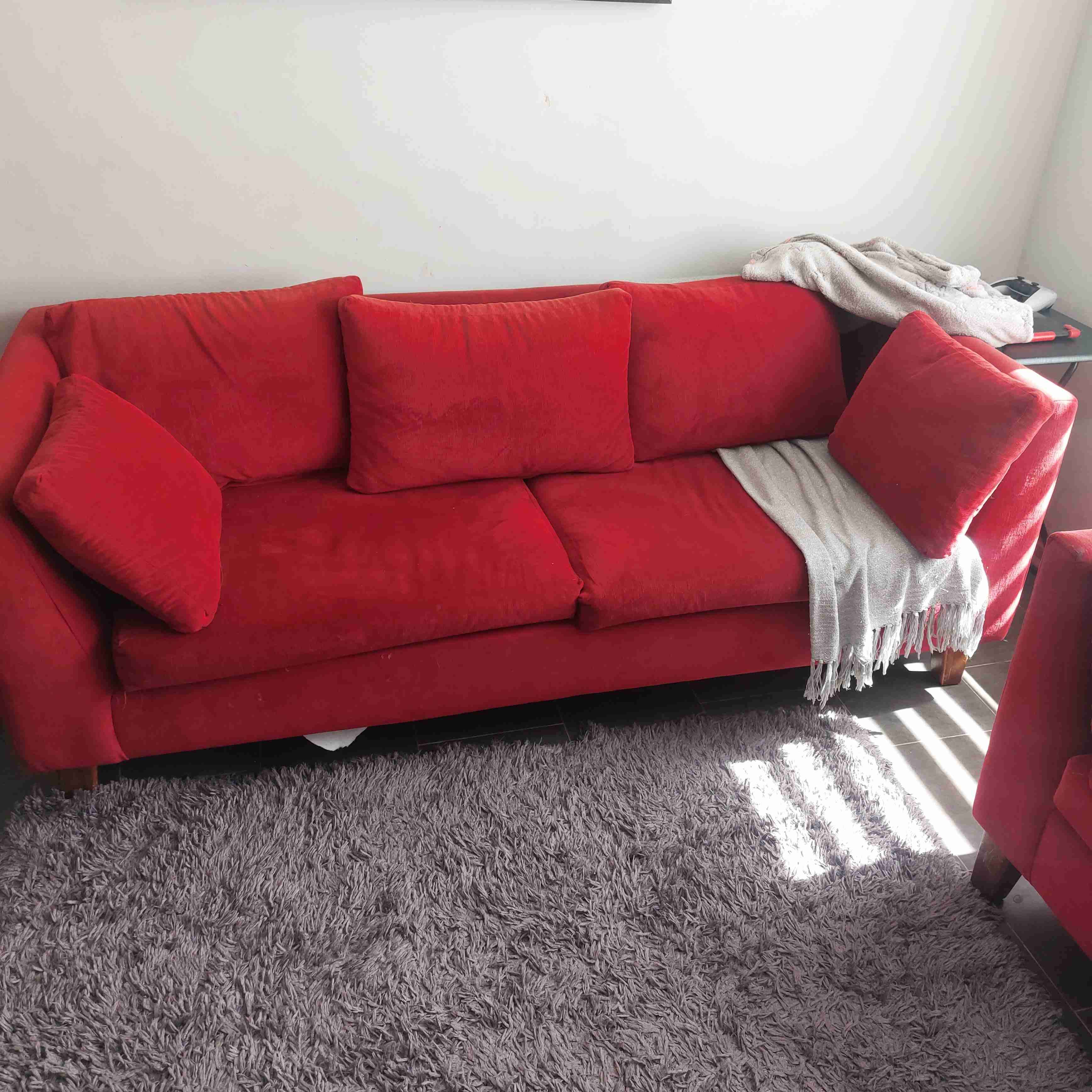 Sofá rojo en buen estado, ideal para living o sala de estar. Acogedor y cómodo con algunos signos leves de uso.