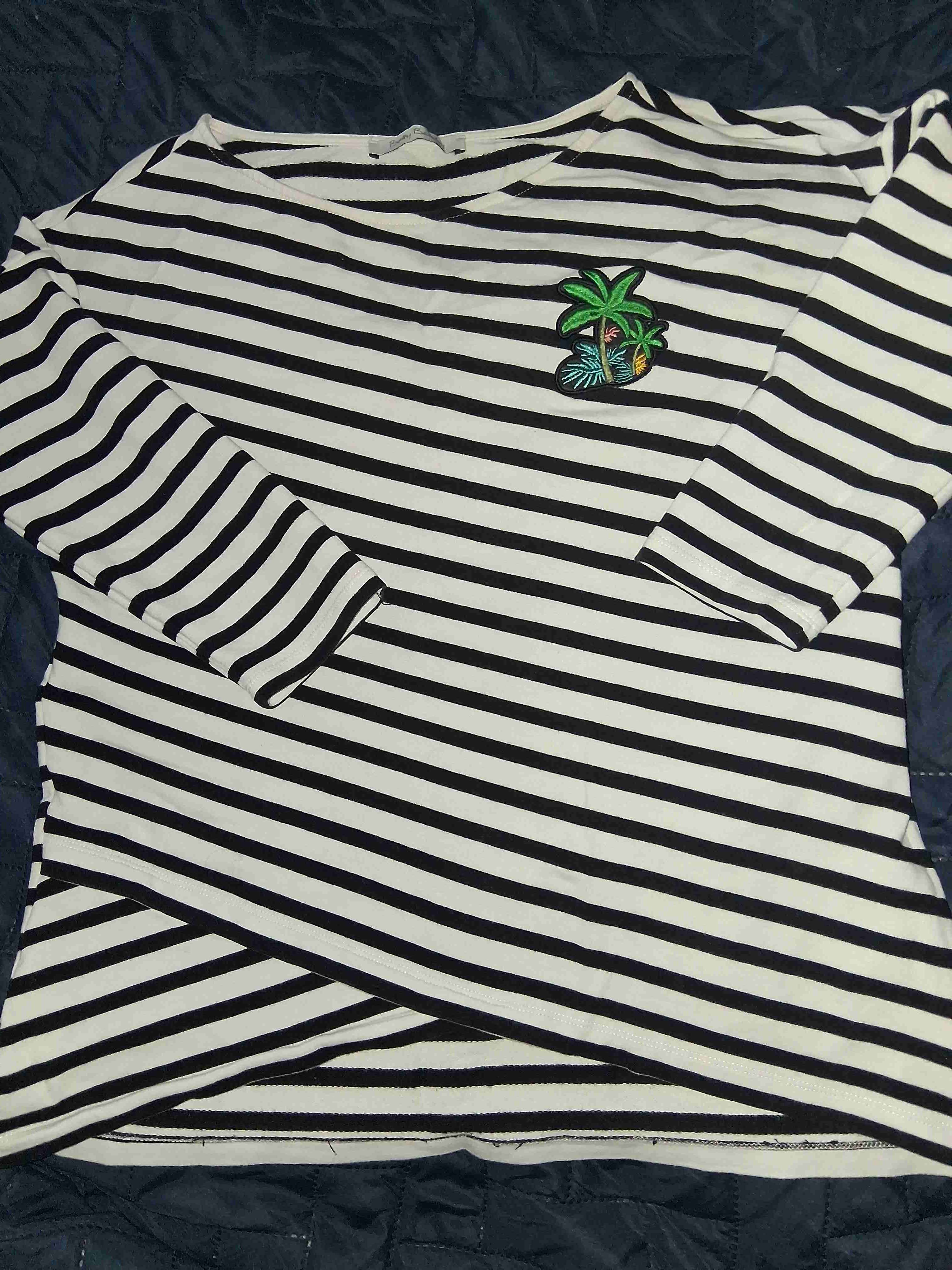 Polera blanca con rayas negras y un parche de palmera y playa. En buen estado, ideal para un look casual.