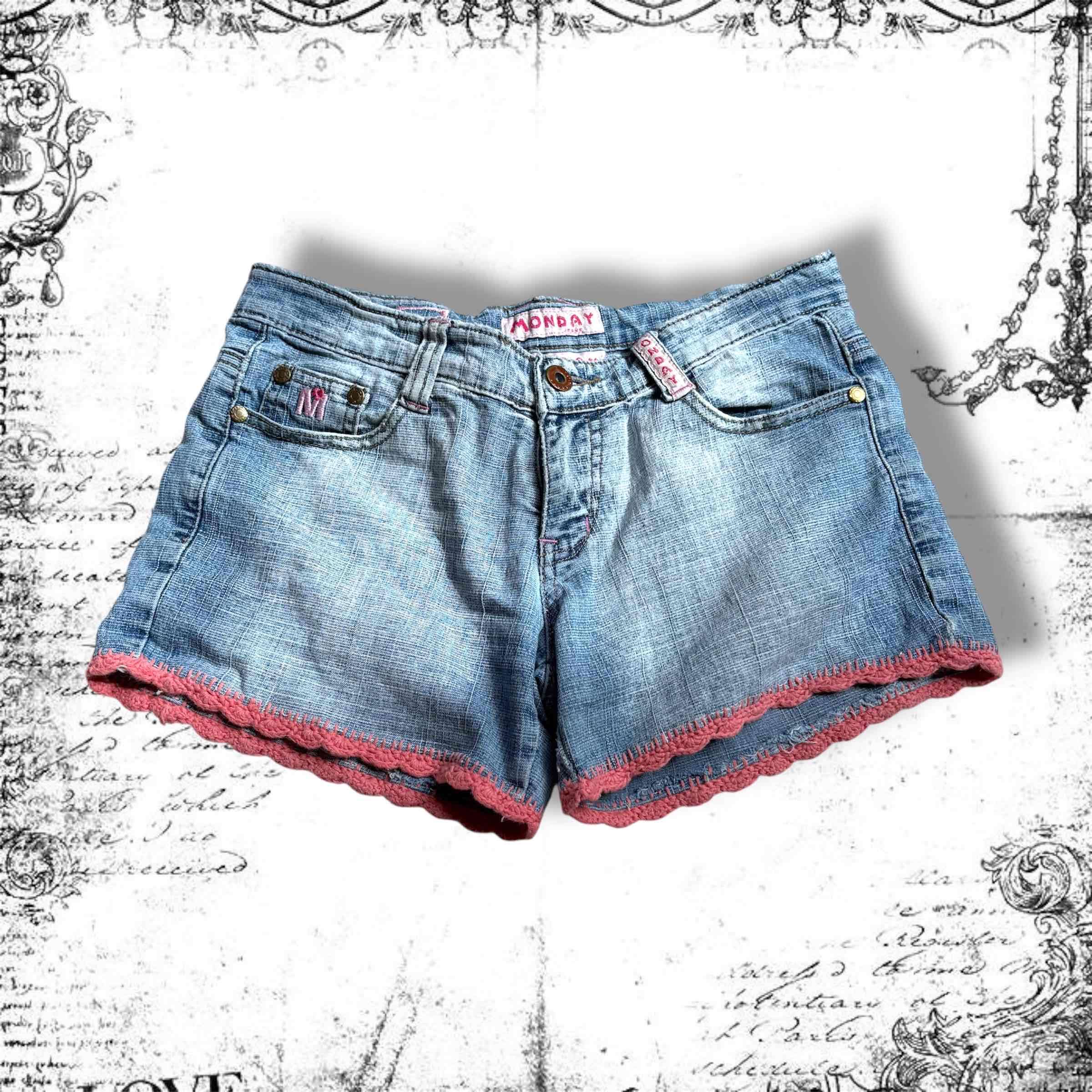 Shorts de mezclilla azul claro con borde rosado. Ideales para uso casual. En buen estado general. Medidas: 30 cm de largo y 35 cm de ancho