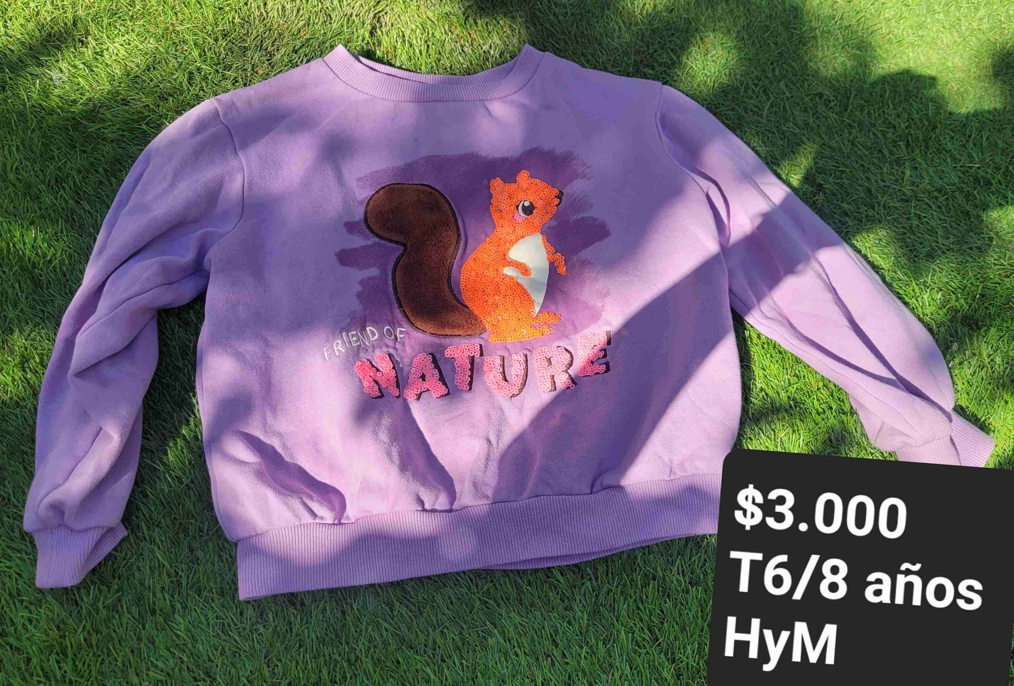 Polerón infantil color morado con diseño de ardilla, en buen estado. Ideal para el uso diario.