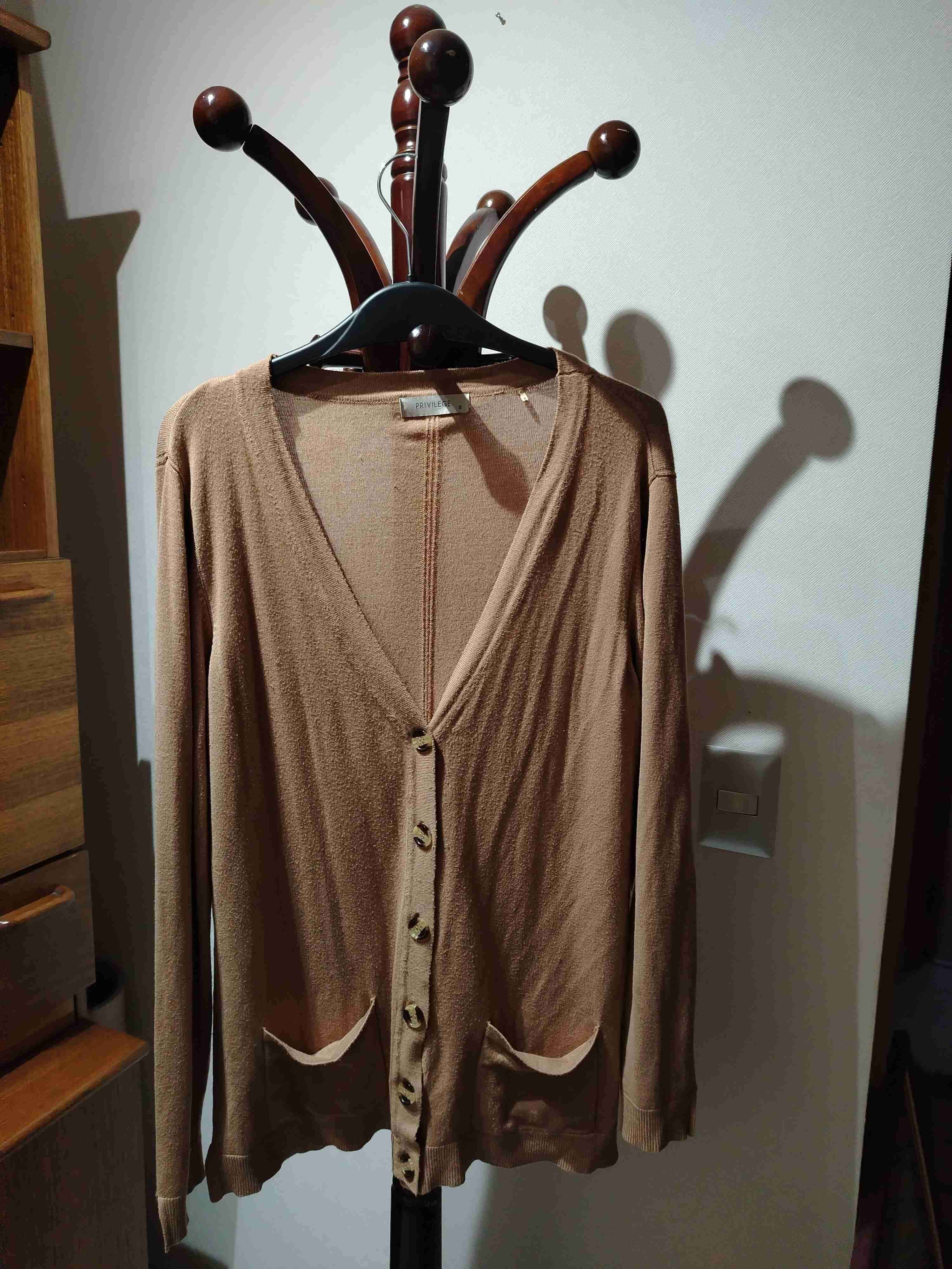 Cárdigan beige clásico en buen estado, ideal para días frescos. Diseño sencillo con botones frontales.