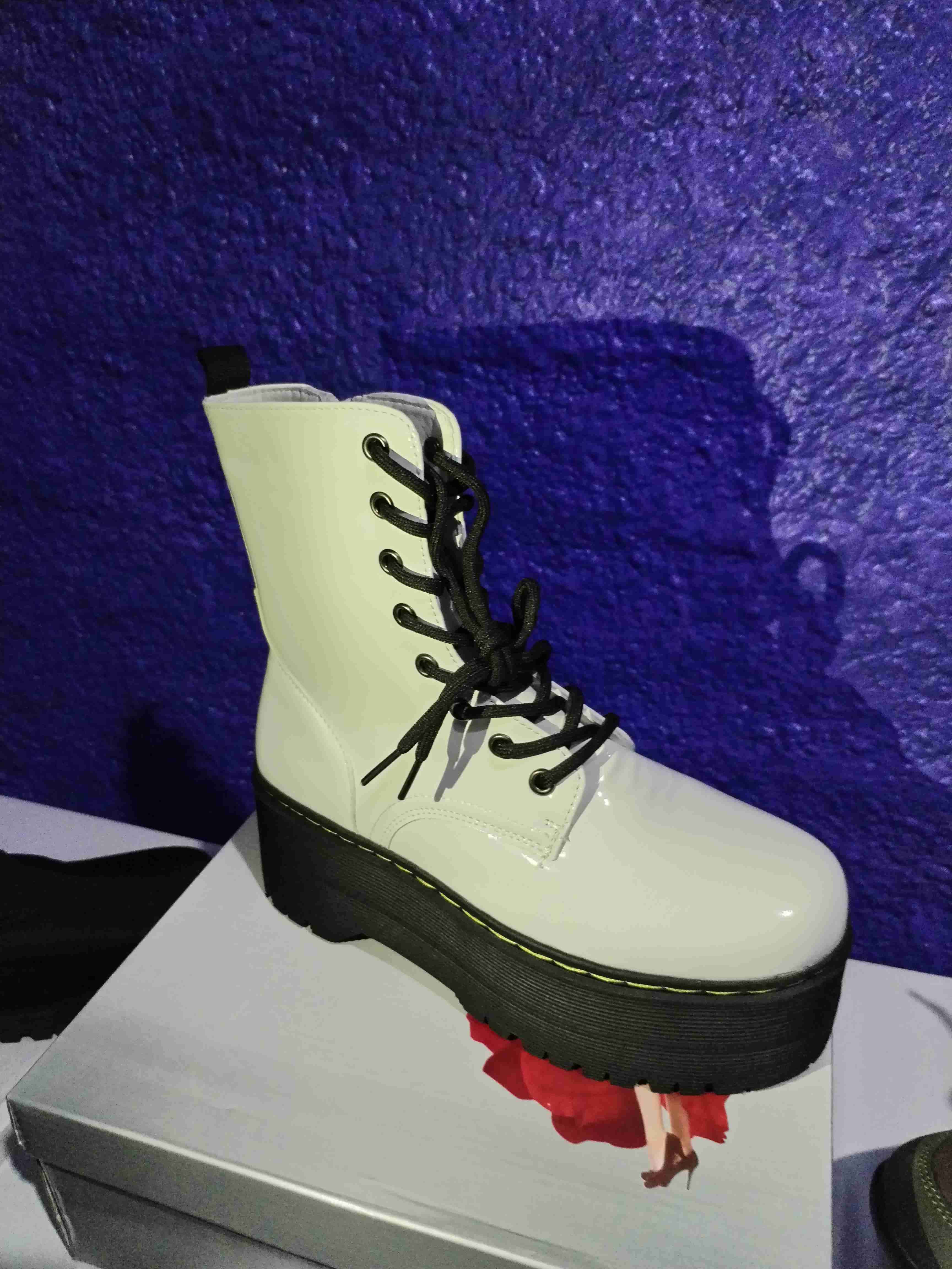Elegantes botas blancas de charol con plataforma y cordones negros. En buen estado y perfectas para un look moderno.