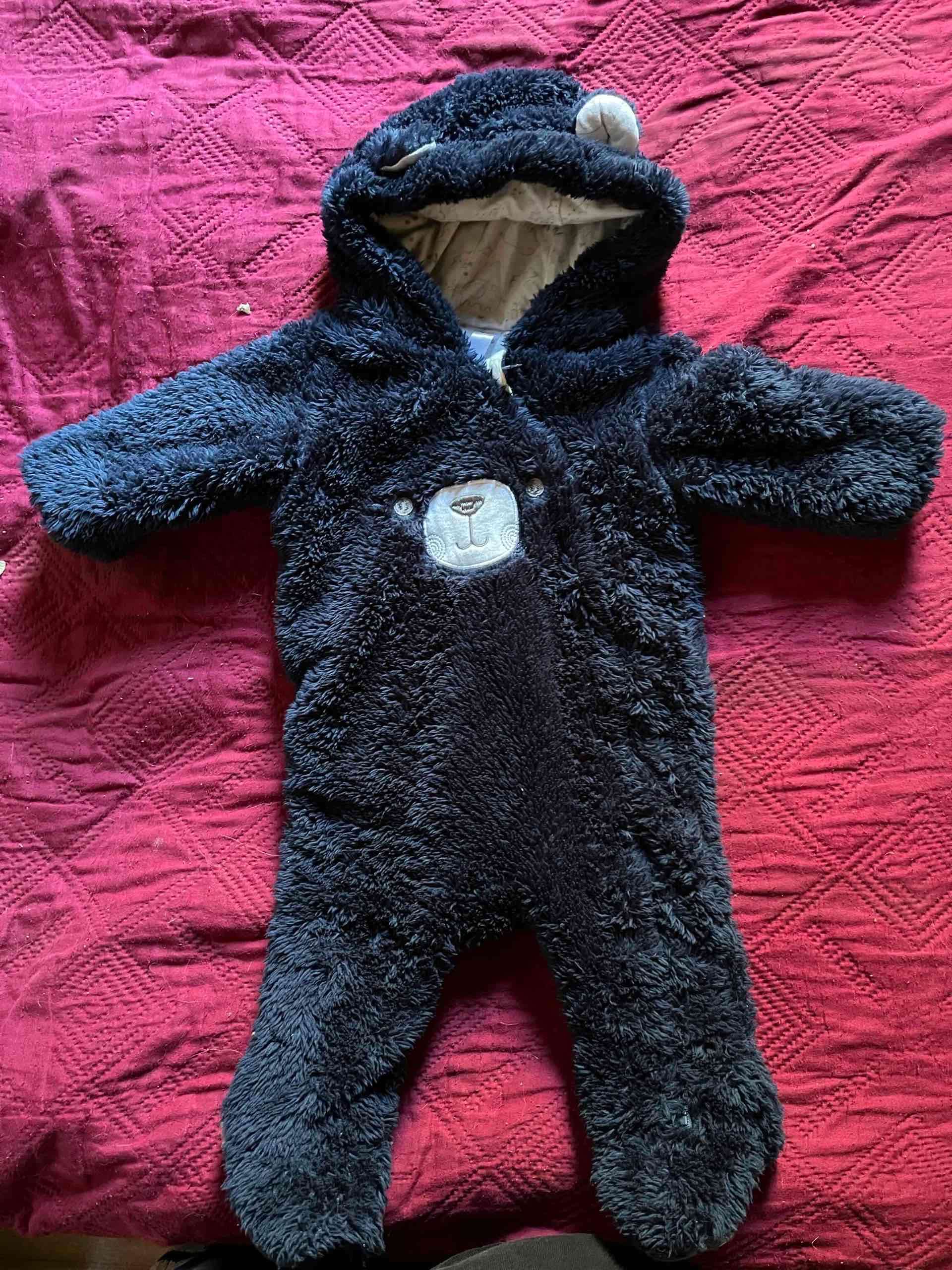Cómodo enterito de peluche, ideal para mantener a tu bebé abrigado. En buen estado, perfecto para el invierno. Negro y azul 3-6 meses Ficcus con detalle 0-3 meses