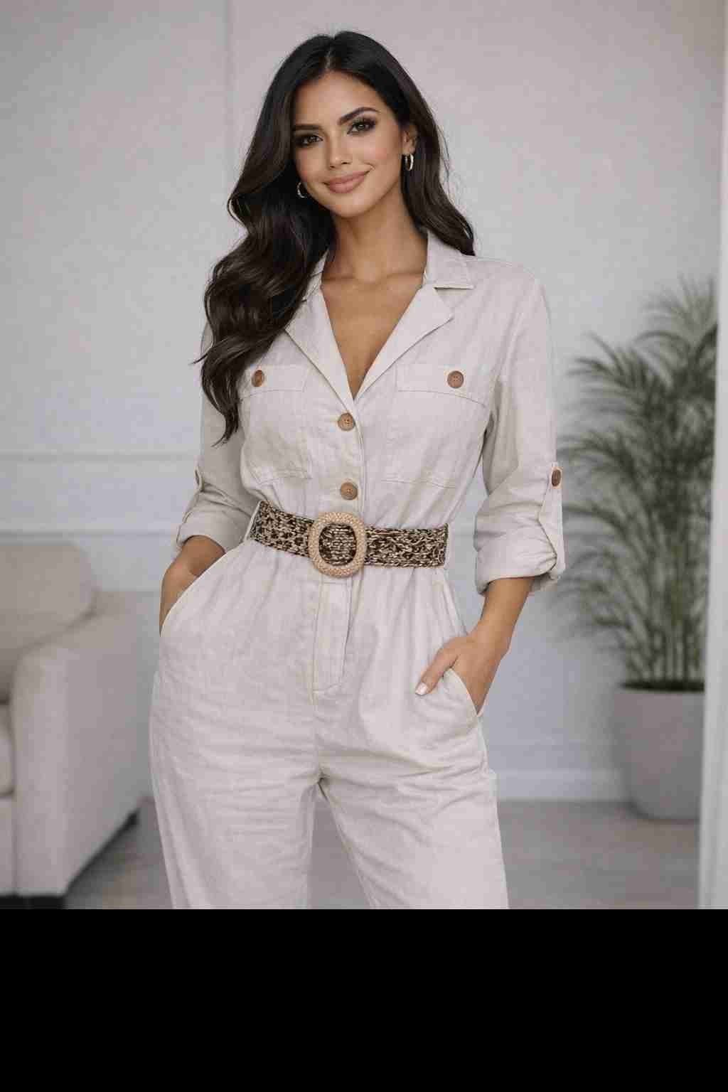 Hermoso enterito beige con cinturón de hebilla grande, ideal para cualquier ocasión. NUEVO cómodo y elegante.