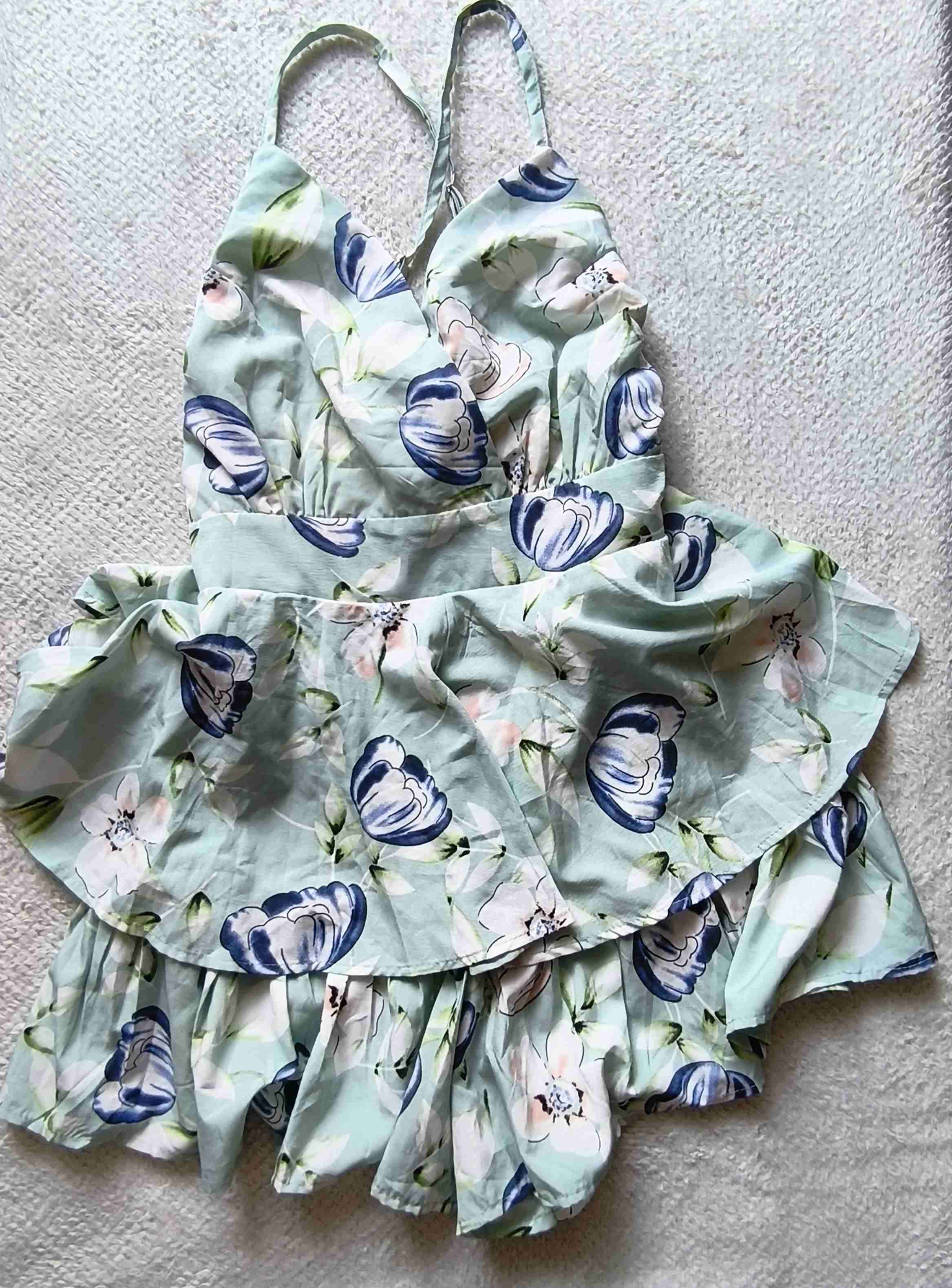 Enterito corto / espalda abierta con tirantes ajustables , diseño floral en tonos azules y verdes. Los volantes en la parte inferior hacen que parezca un vestido. En buen estado general.