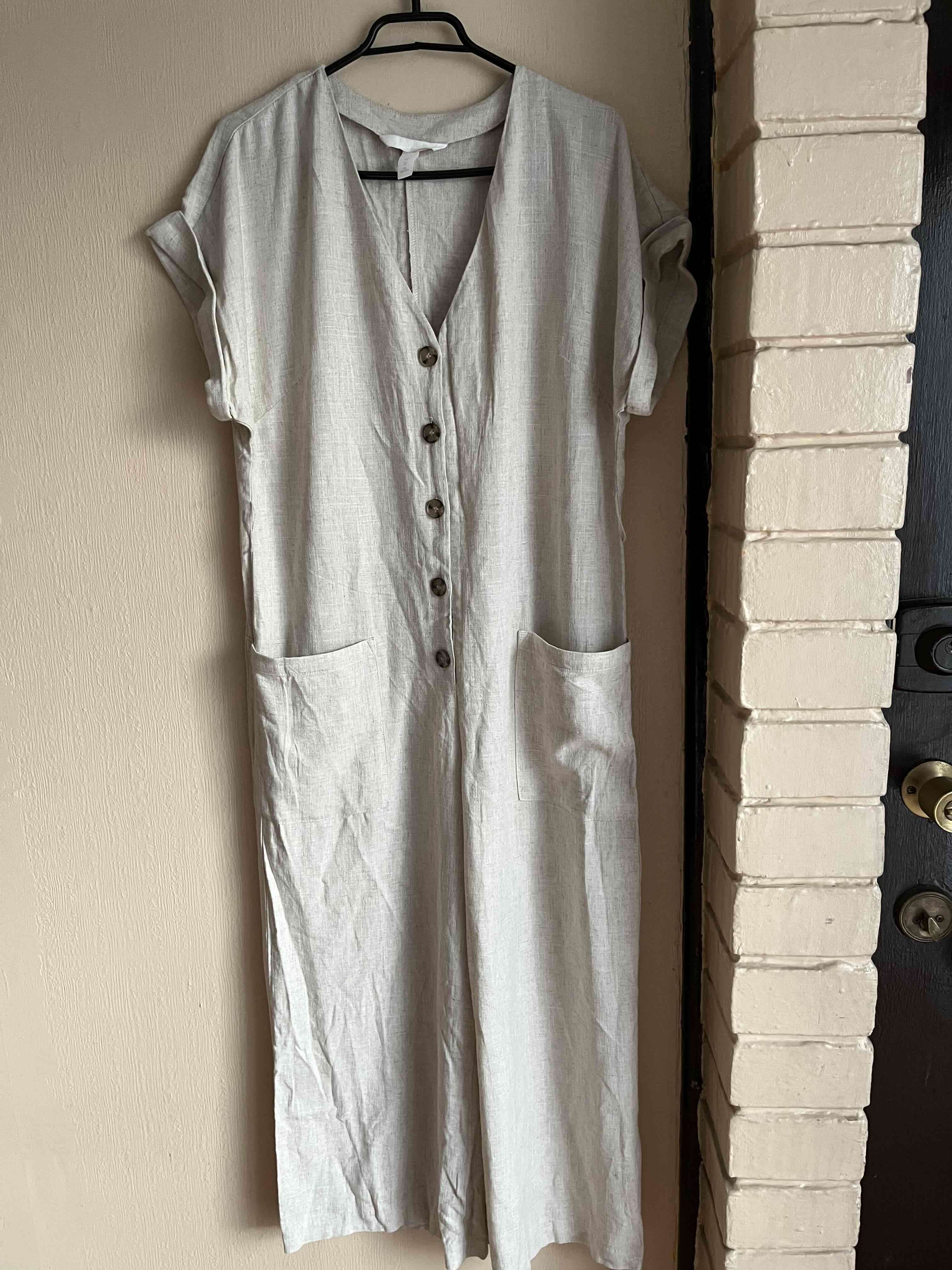 Enterito (mono) de lino estilo casual, beige claro con botones frontales y bolsillos. Perfecto para días de verano. Marca HyM talla 38
