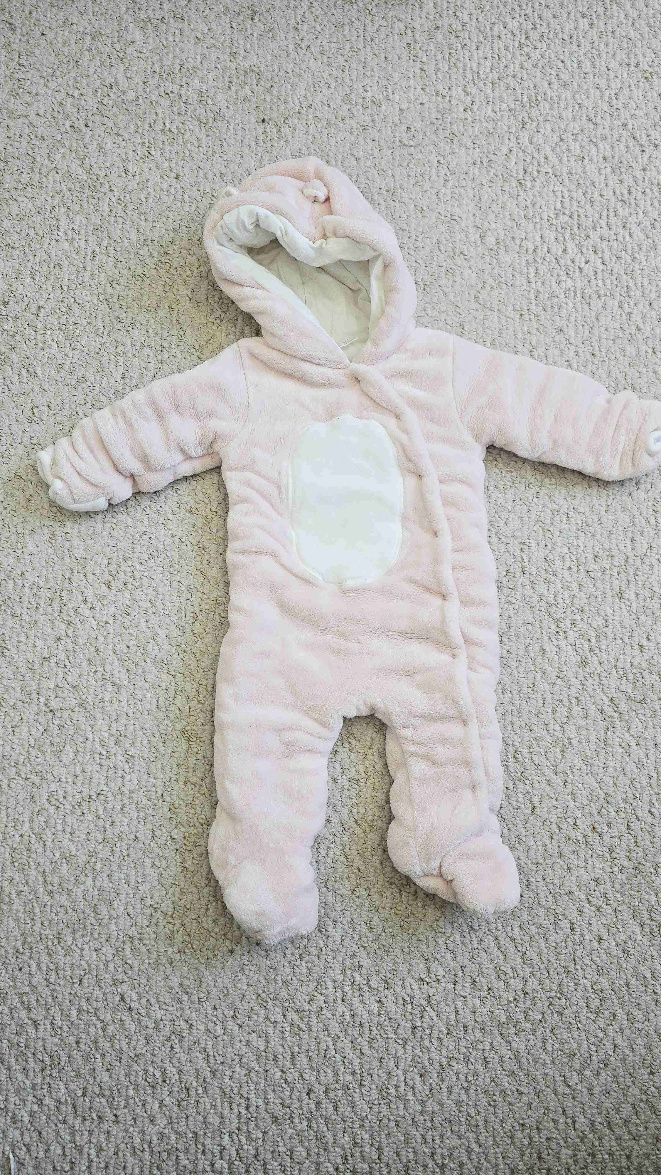 Enterito suave de polar rosado con capucha, ideal para el invierno. Estado impecable. Talla 9M, 76cm