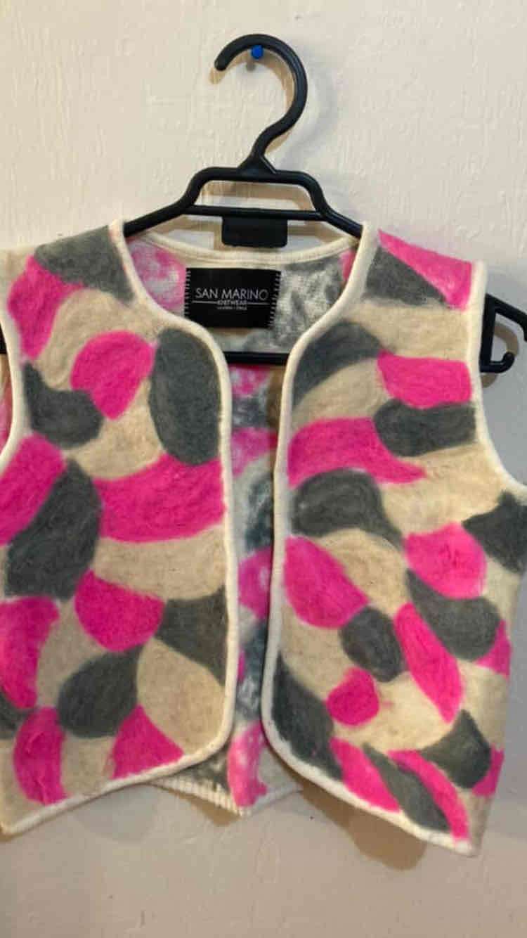 Chaleco sin mangas de lana, diseño llamativo en gris y fucsia. Ideal para destacar en tus outfits diarios.