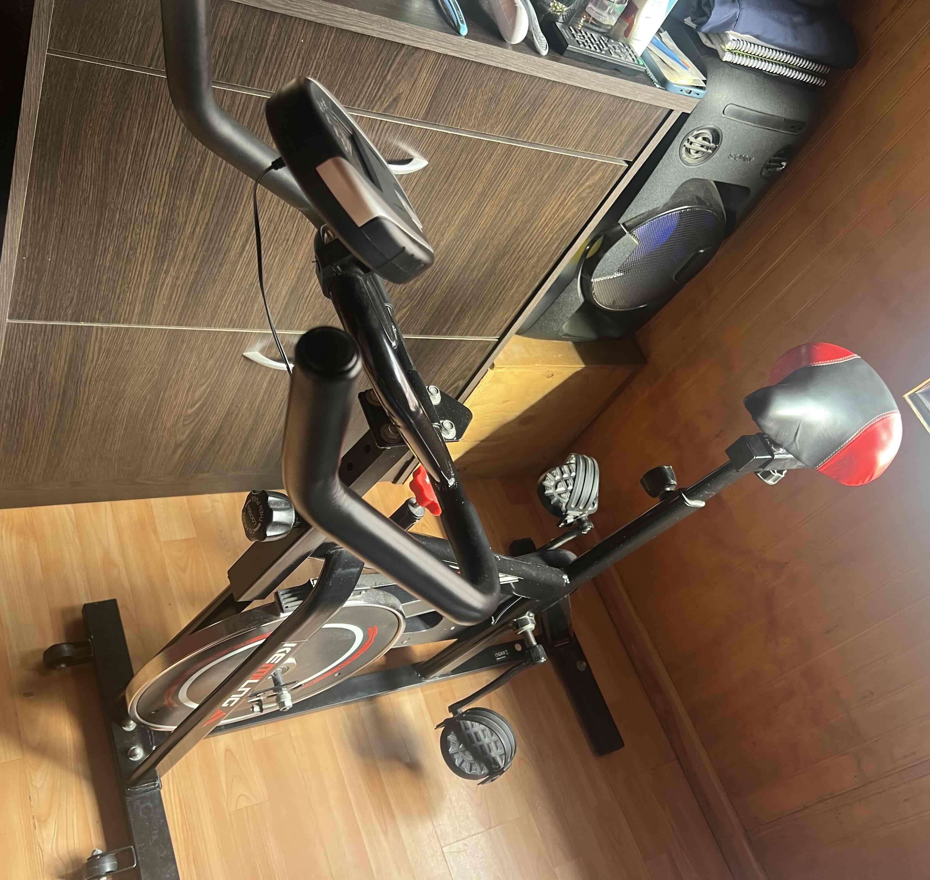 Bicicleta estática para interior en buen estado, perfecta para entrenamiento en casa. Color negro con detalles rojos.