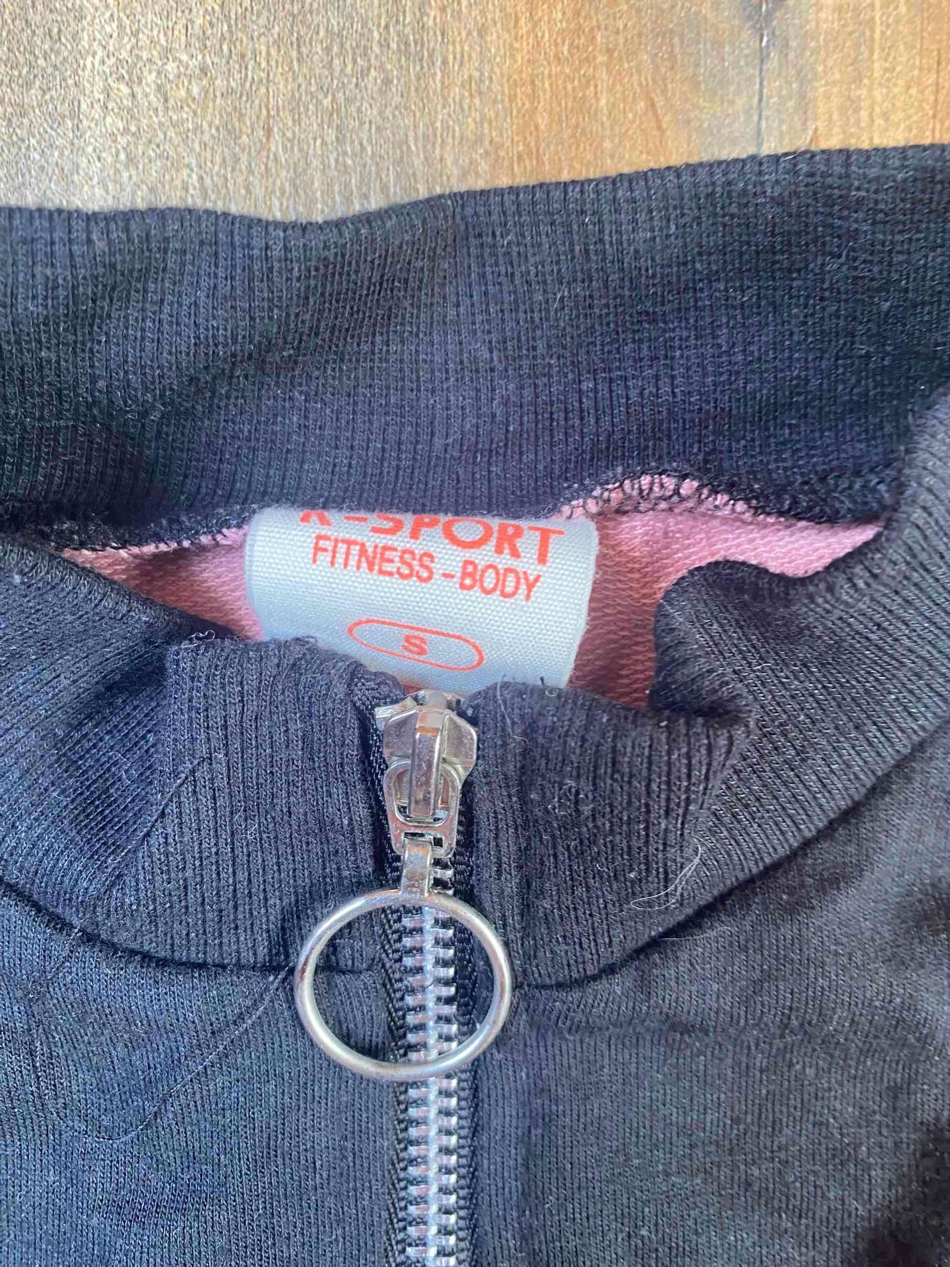 Polerón de deporte negro con cierre metálico, ideal para entrenar. Buen estado, talla S. Tiene una mancha