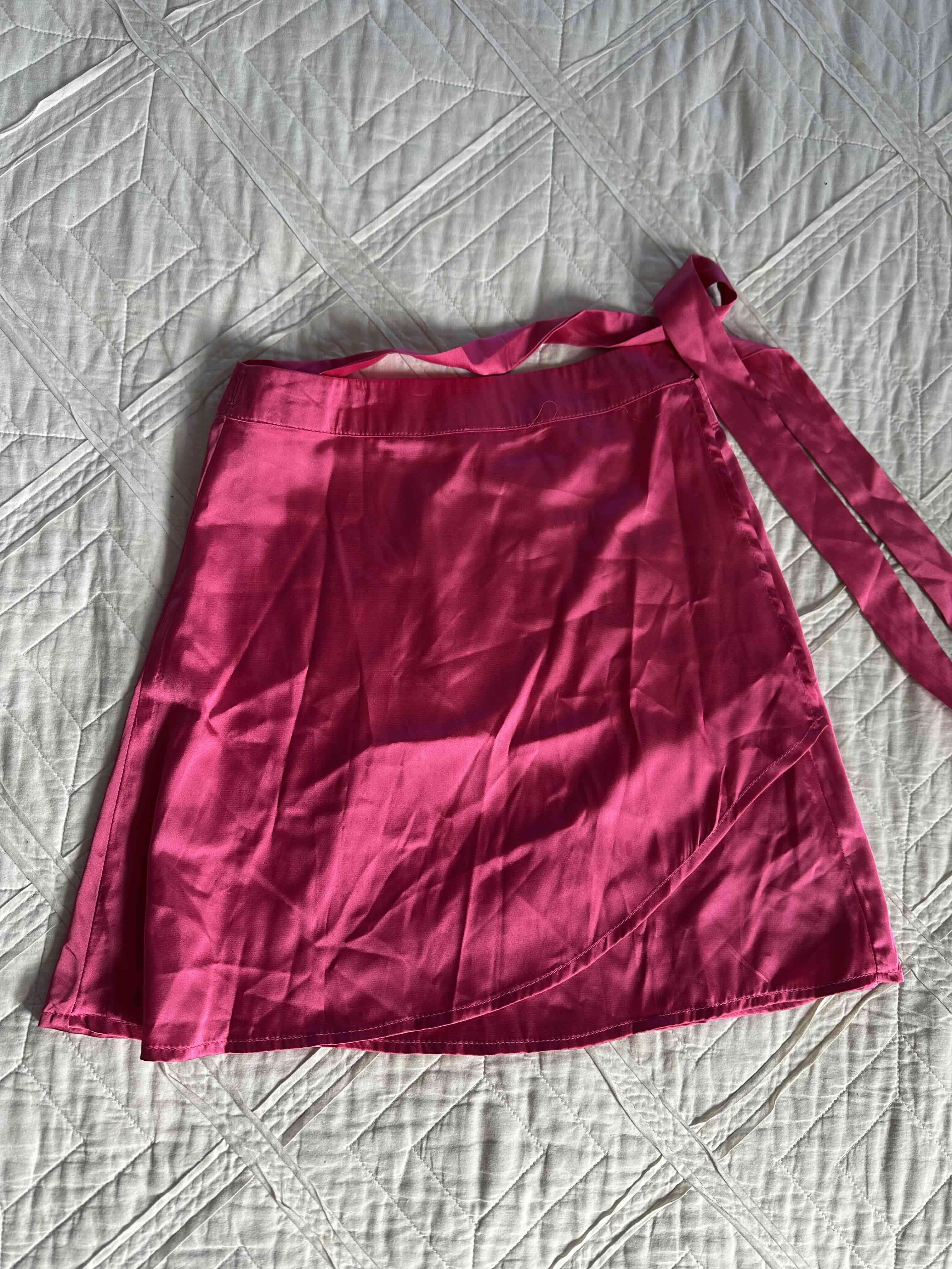 Falda corta fucsia, diseño cruzado con lazo. Perfecta para días casuales.
