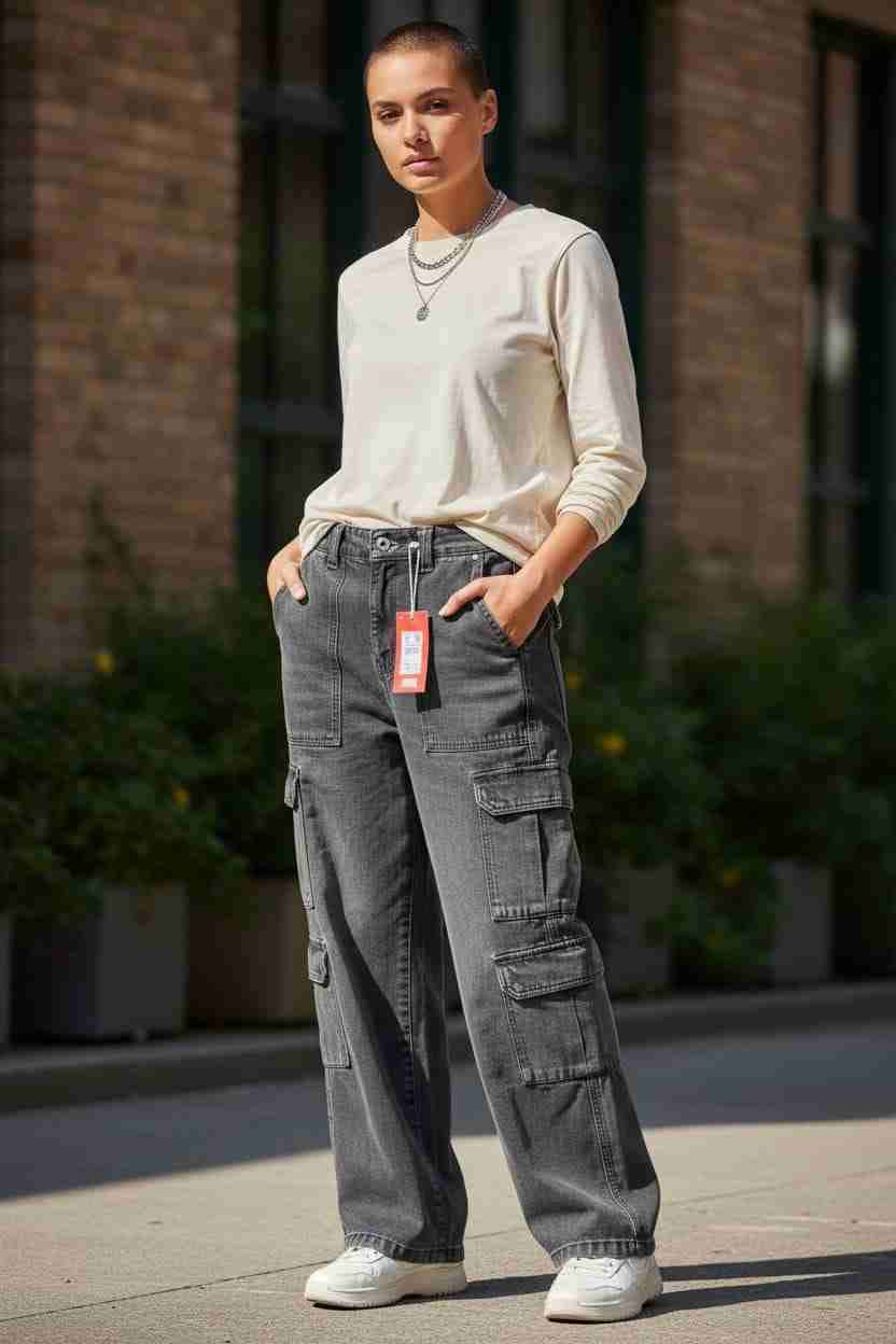 Pantalones cargo estilo casual con múltiples bolsillos, perfectos para un look relajado. En buen estado, con etiquetas visibles.