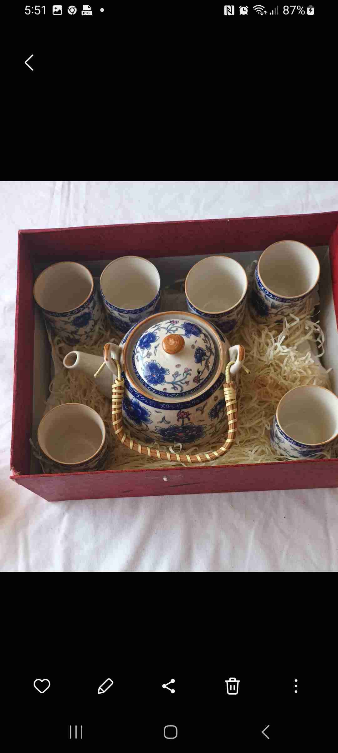 Hermoso set de té con diseño floral azul. Incluye tetera y seis tazas en caja original. Ideal para decorar y disfrutar en familia.