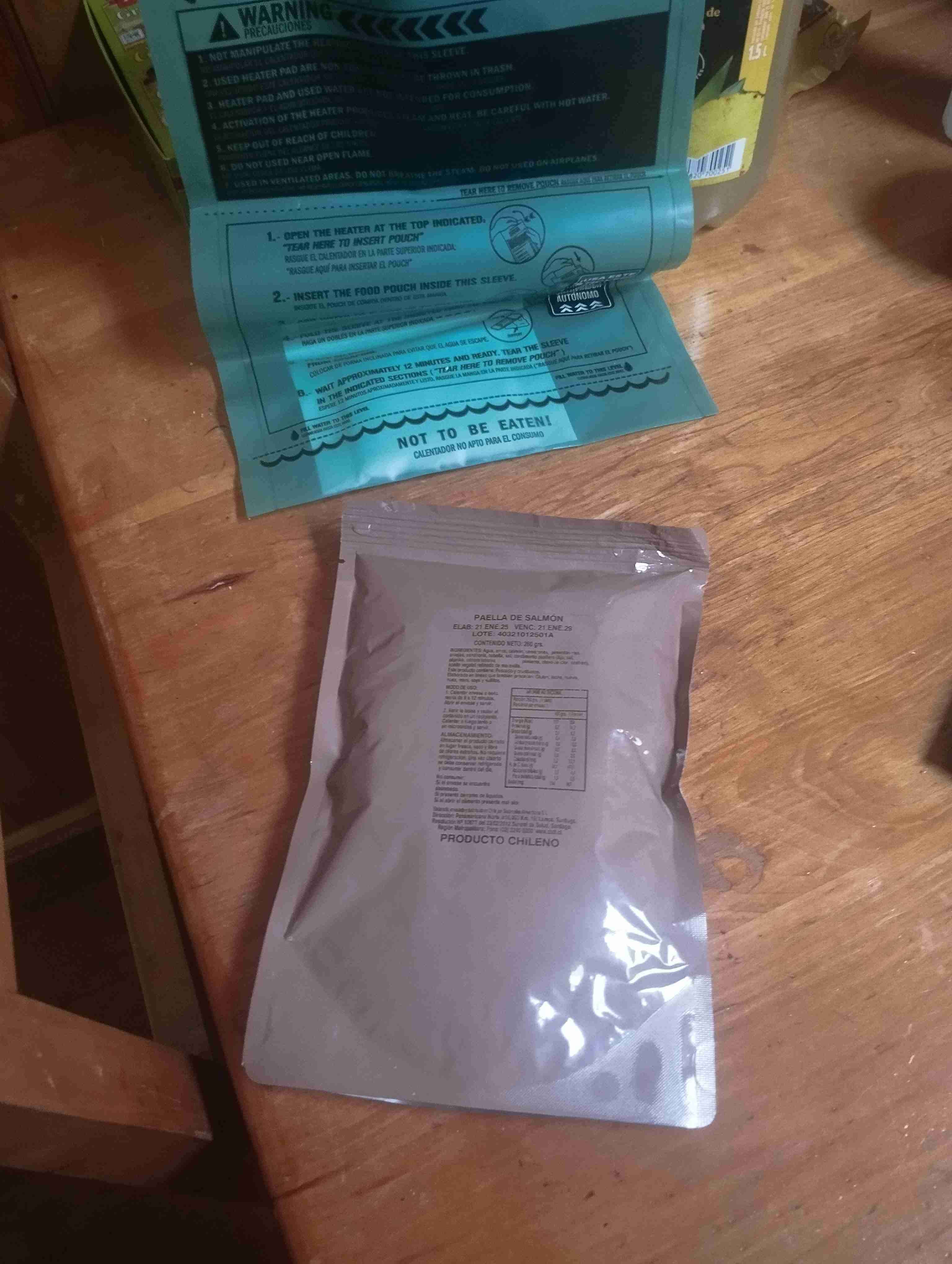 Ración de emergencia paella de salmón, ideal para camping o situaciones de supervivencia. Producto chileno, en buen estado. Vienen 3 pastas con salsa boloñesa 2 arroz con pollo al curry 1 lenteja guisada 1 paella de salmón Cada comida viene con su propia bolsa calentadora Además de 2 frutillas al jugo 1 macedonia al jugo 1 durazno al jugo
