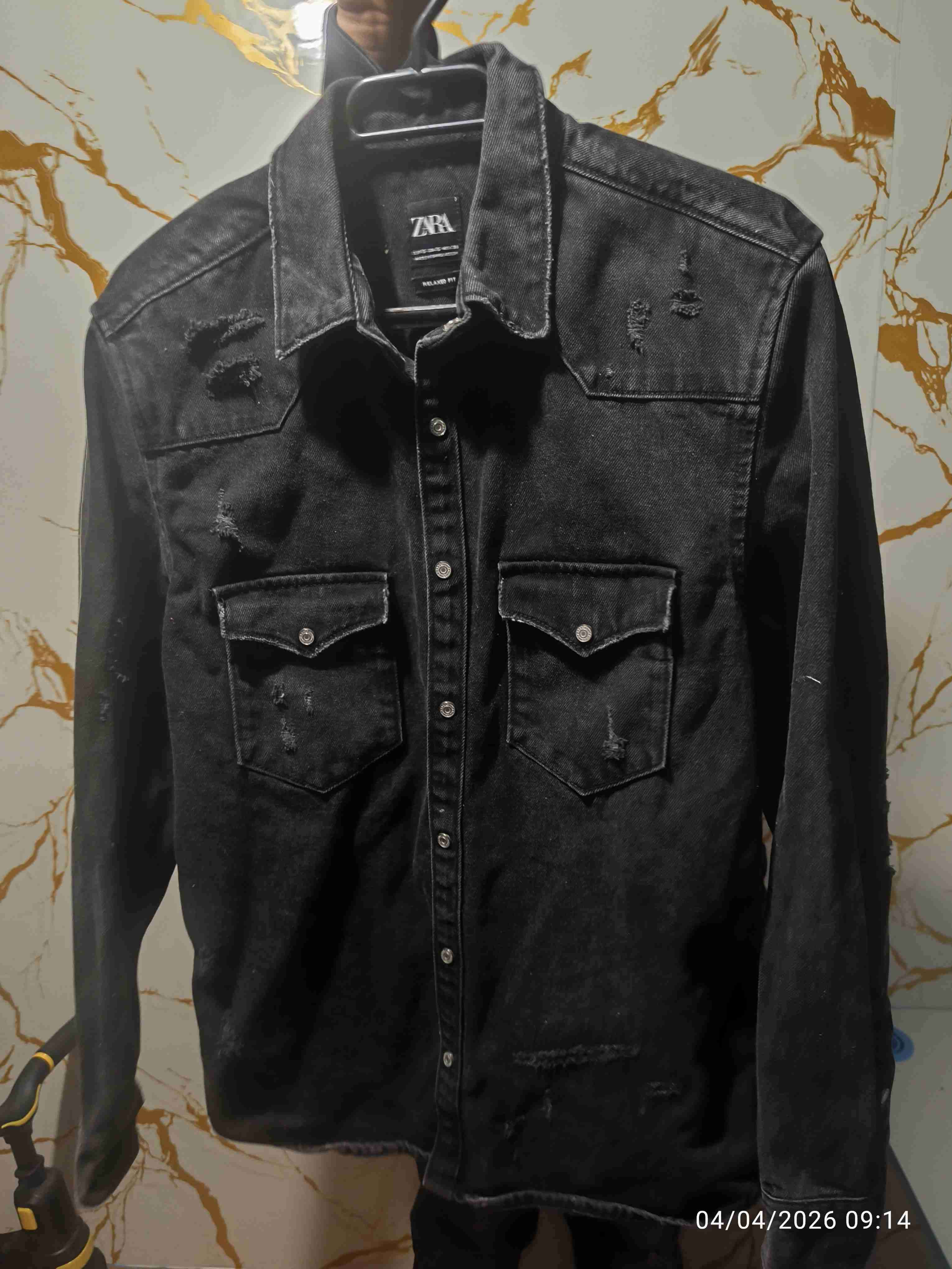 Chaqueta de mezclilla negra con efecto desgastado, estilo casual y moderno. Ideal para el uso diario.