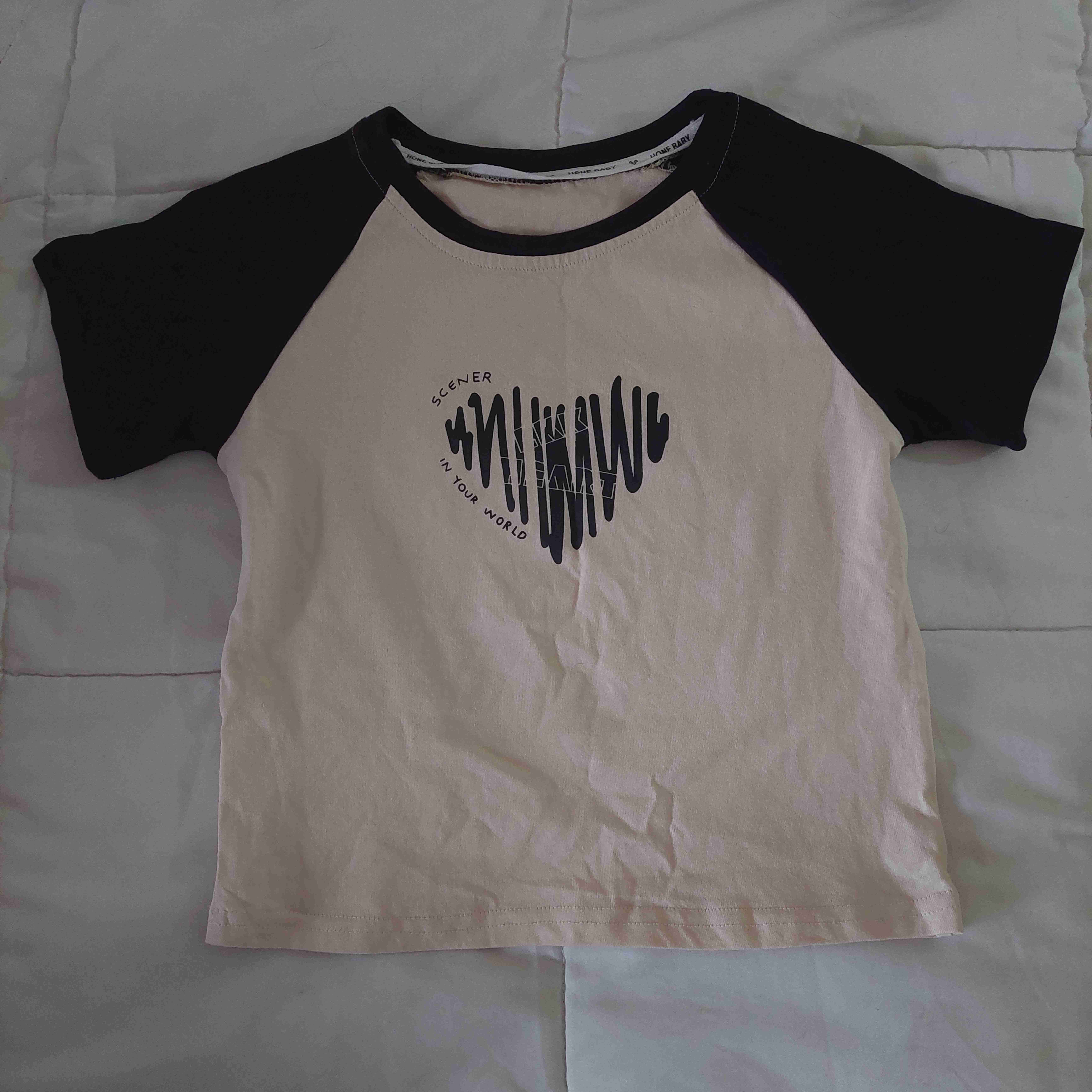 Polerablanca con mangas negras y diseño estampado al frente. En buen estado, ideal para uso casual. Es talla 10 pero da para un xs