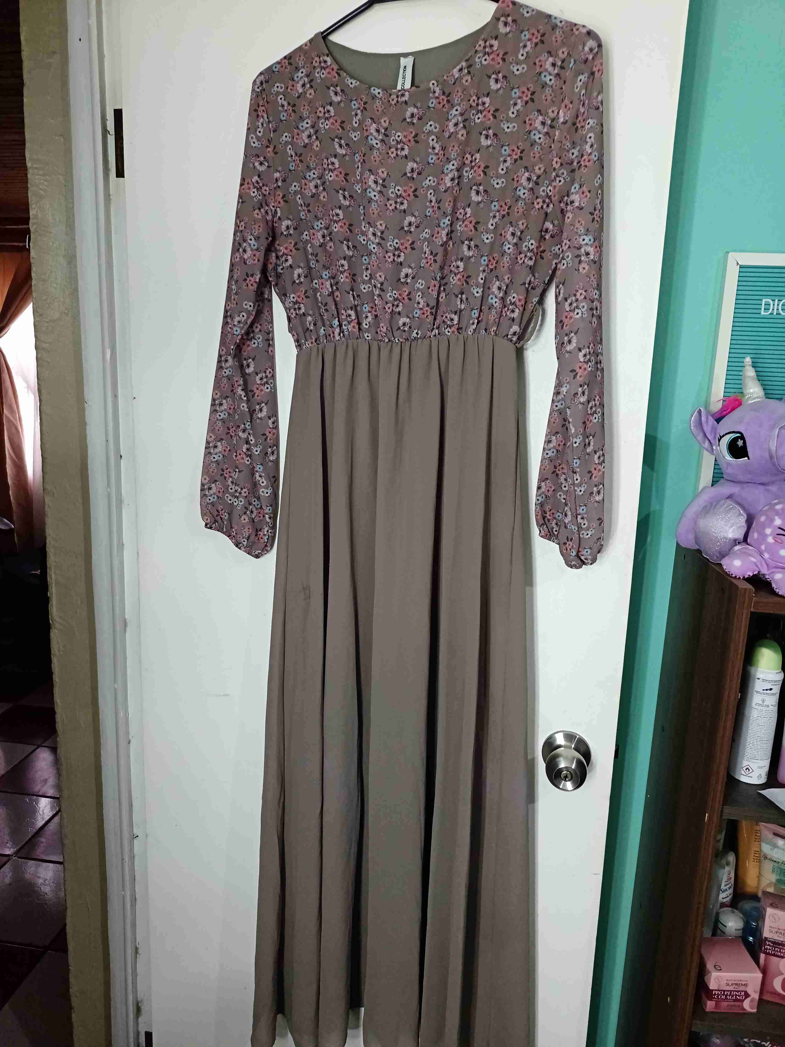 Vestido largo con diseño floral y mangas largas, ideal para ocasiones semi-formales. Buen estado.