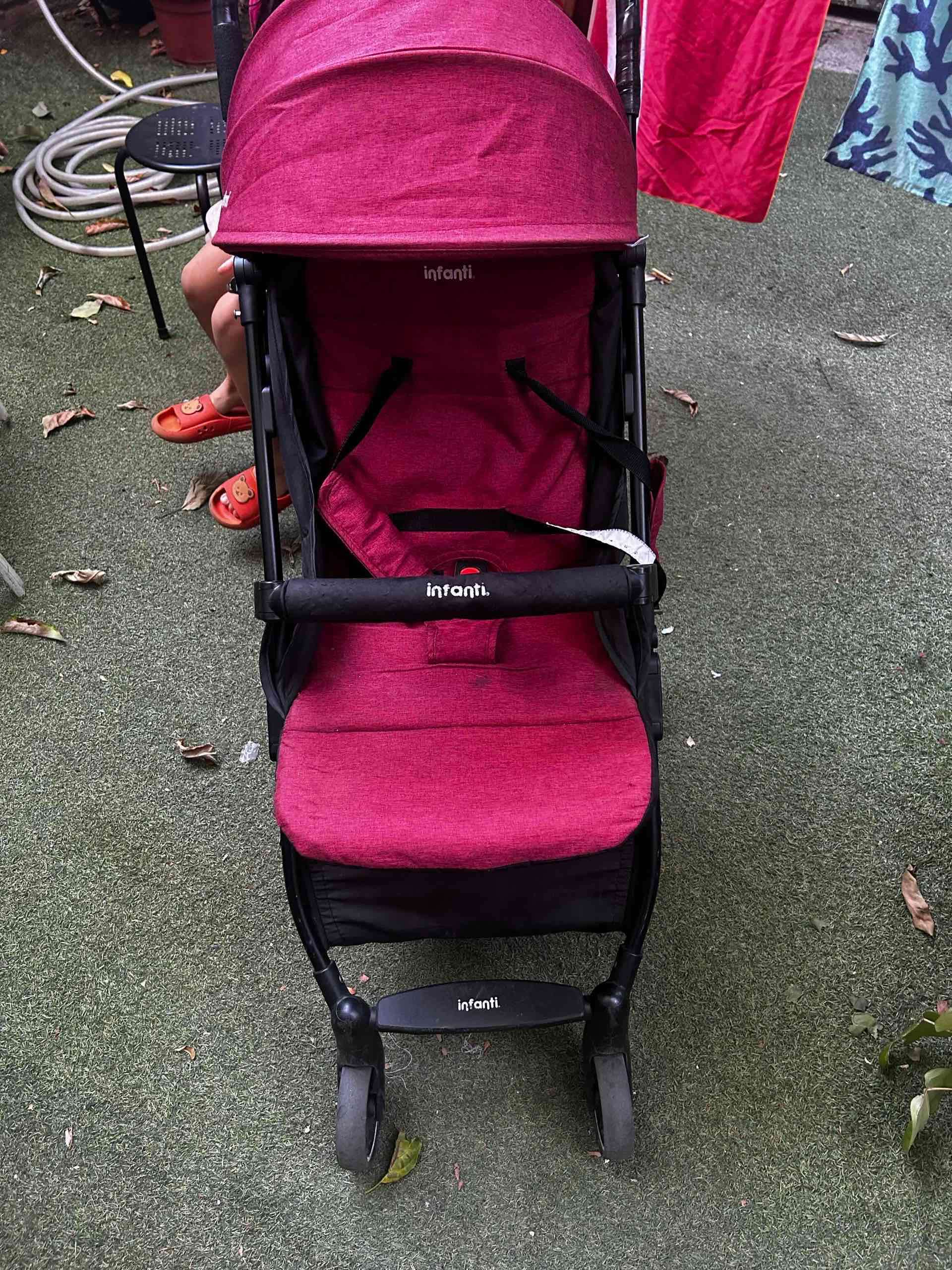 Coche de paseo Infanti en buen estado, color rojo vibrante. Ideal para paseos cómodos y seguros.