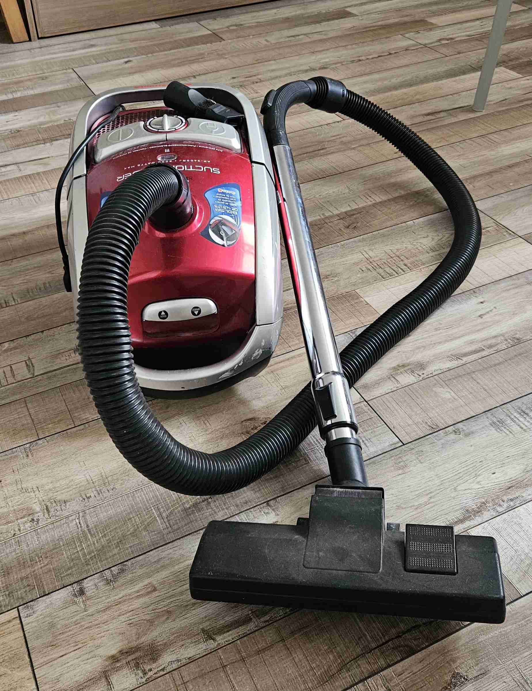 Aspiradora trineo Sindelen modelo AP-3400RJ en color rojo. Potencia: Máxima de 2000 Watts con regulador electrónico de potencia. Capacidad: Bolsa de género con capacidad de 4.5 litros. Accesorios: Incluye tubo telescópico metálico y accesorio Turbo Brush para alfombras. Características: Control de succión en el mango, encendido a pie y cable retráctil de 5 metros. Único detalle: cable trabado, se debe arreglar.