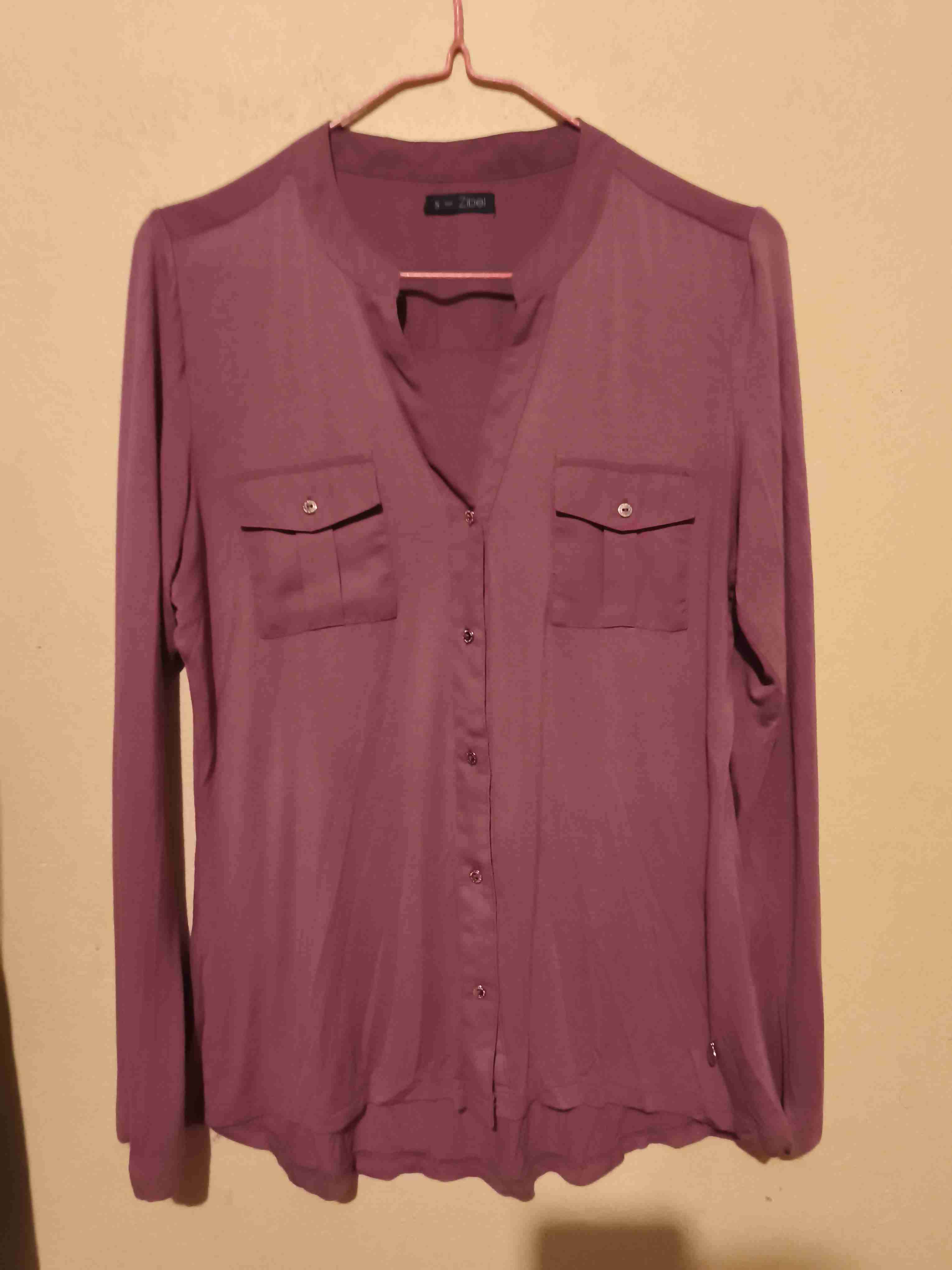 Blusa elegante de color morado con dos bolsillos frontales. Ideal para usar en ocasiones casuales o formales.