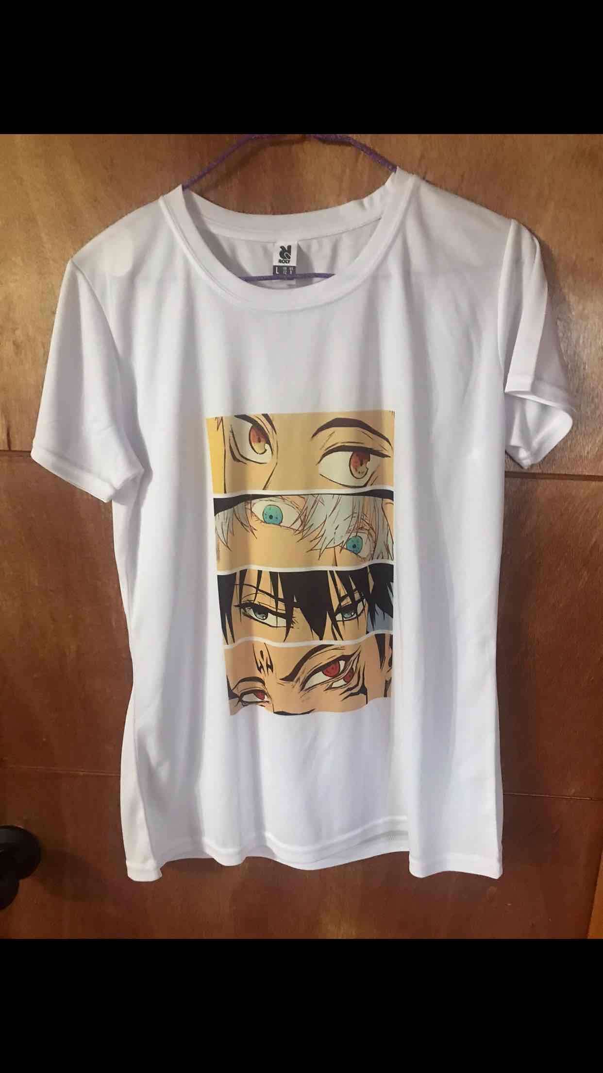 Polera blanca de manga corta con estampado de ojos de personajes de anime. Ideal para fans del género. En buen estado