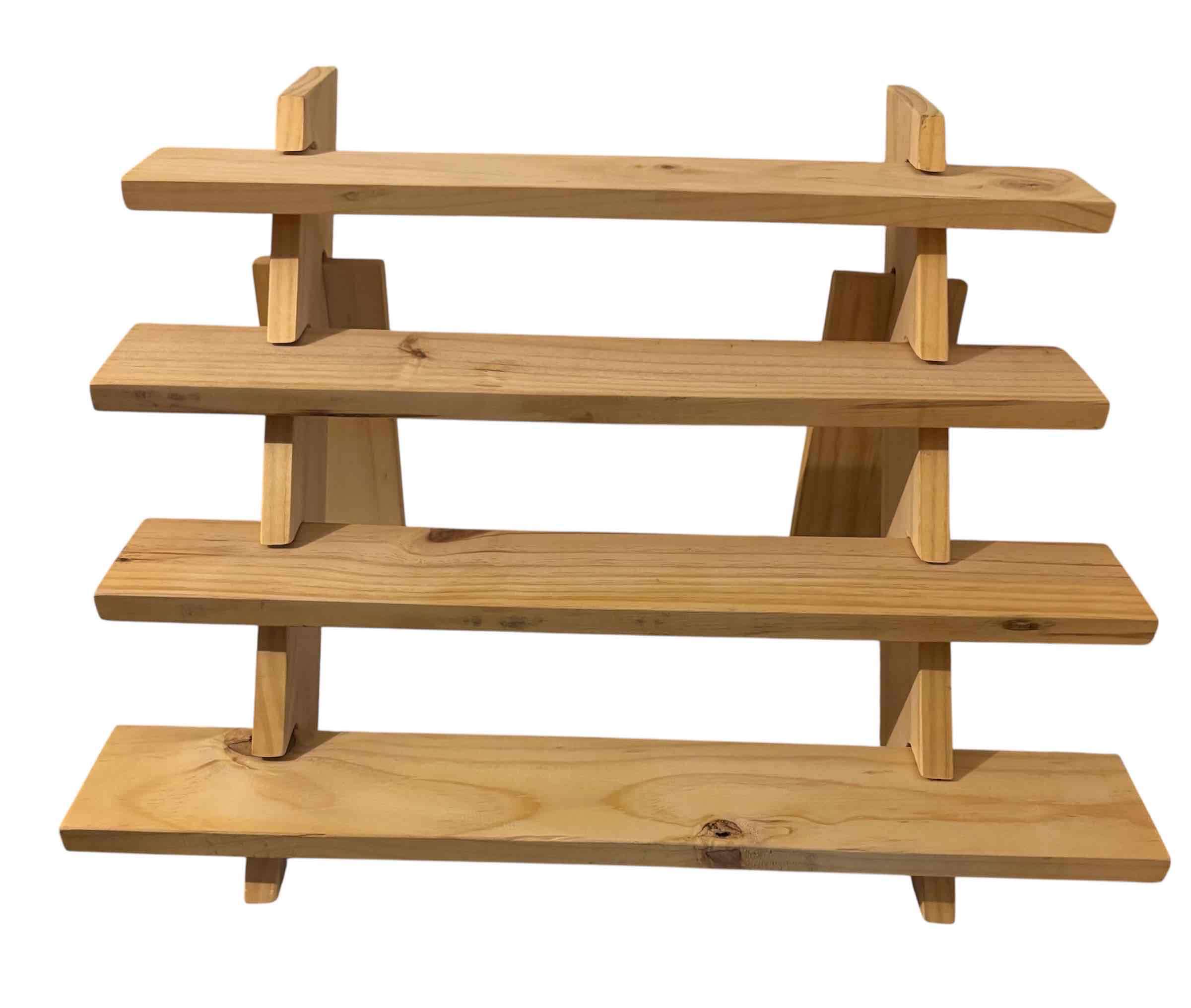 Exhibidor de madera de pino lijado con cuatro niveles desmontable. Ideal para exposiciónes en ferias y mercados. Buen estado. Medias 60cm de ancho, 36 cm de alto y 50 cm de fondo.