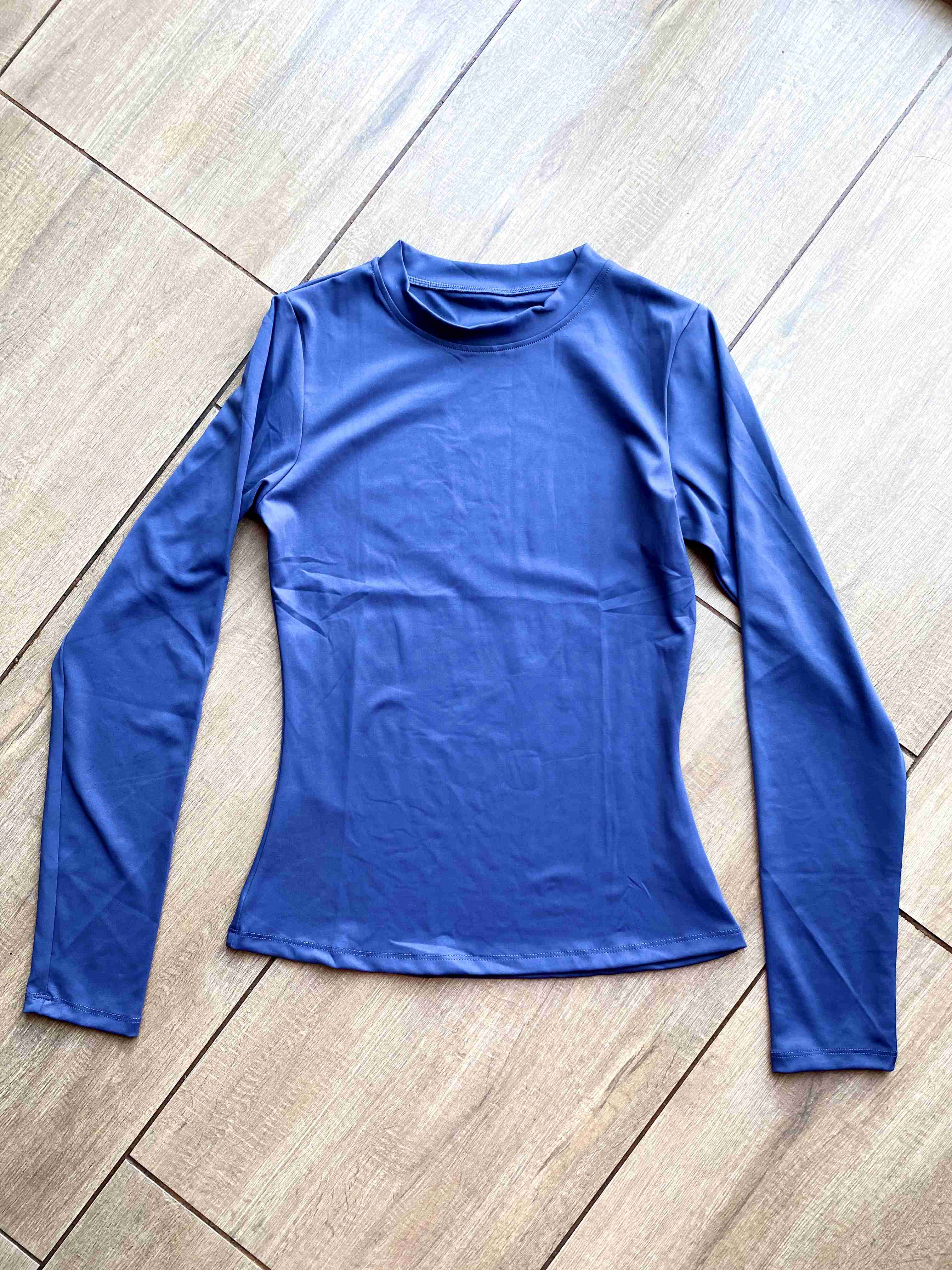 Polera azul de manga larga, ideal para días frescos. Deportiva