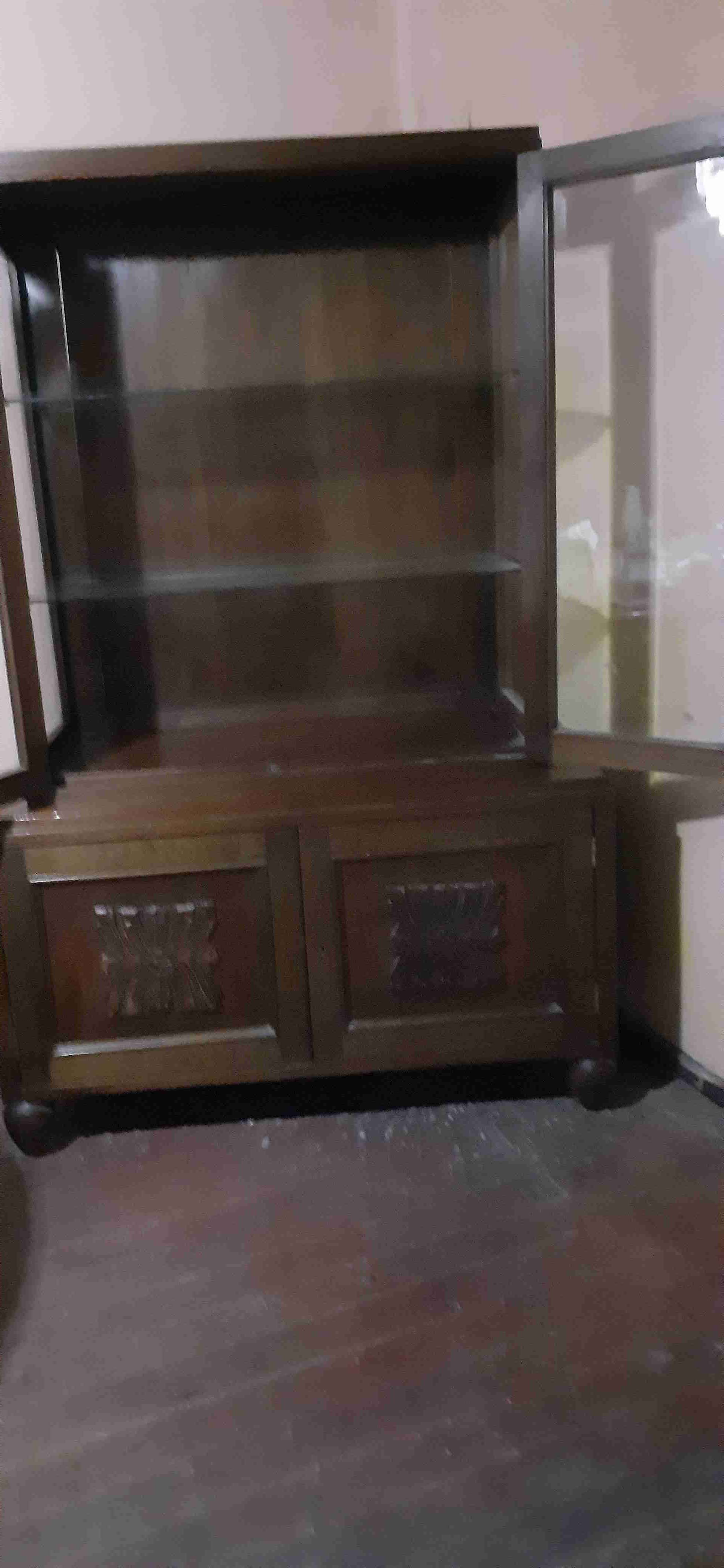 Vitrina clásica de madera con puertas de vidrio. Perfecta para exhibir tus colecciones o guardar libros. En buen estado con signos normales de uso.