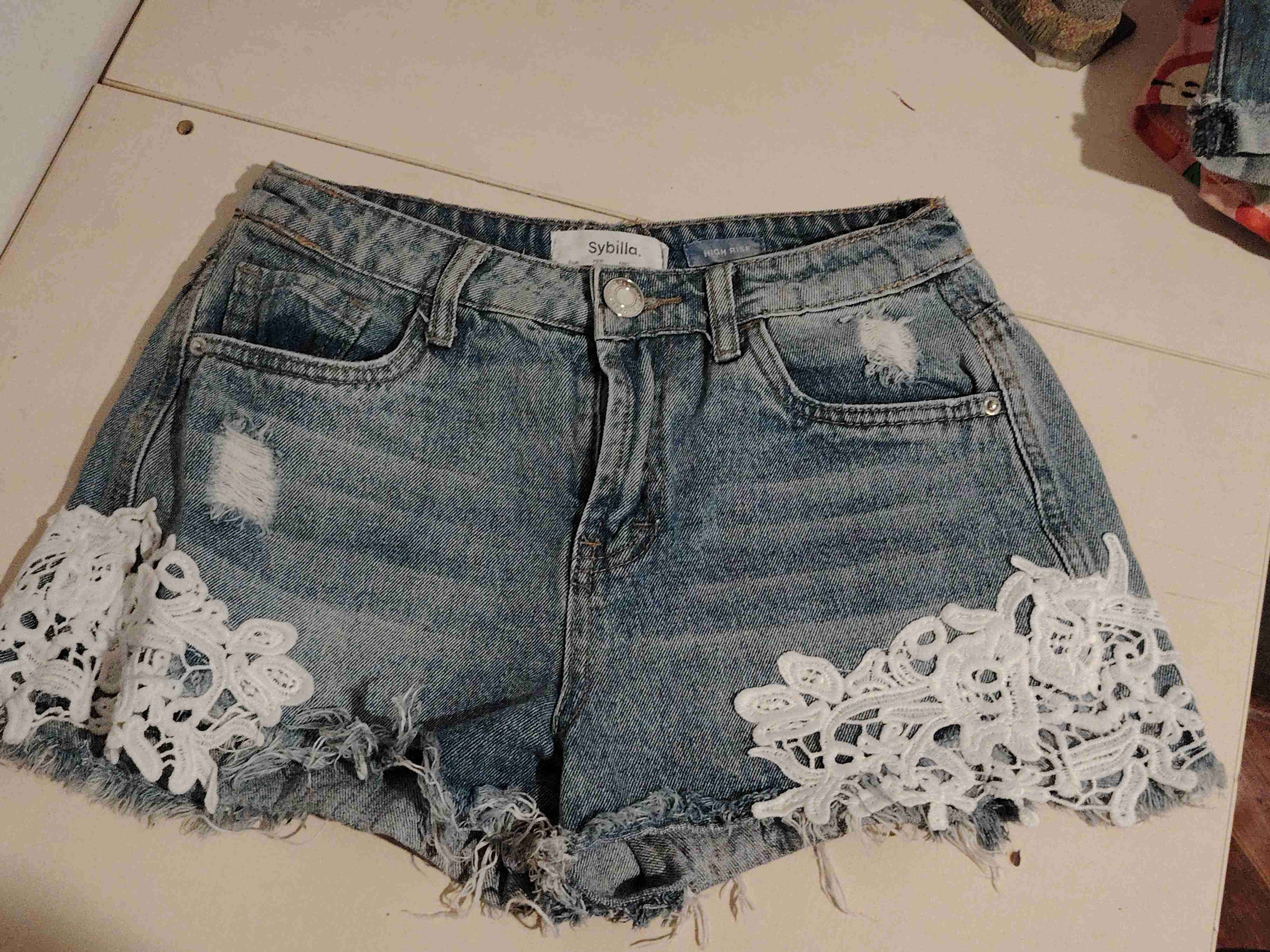 Shorts de mezclilla azul con detalles de encaje blanco. Buen estado, ideal para el verano.