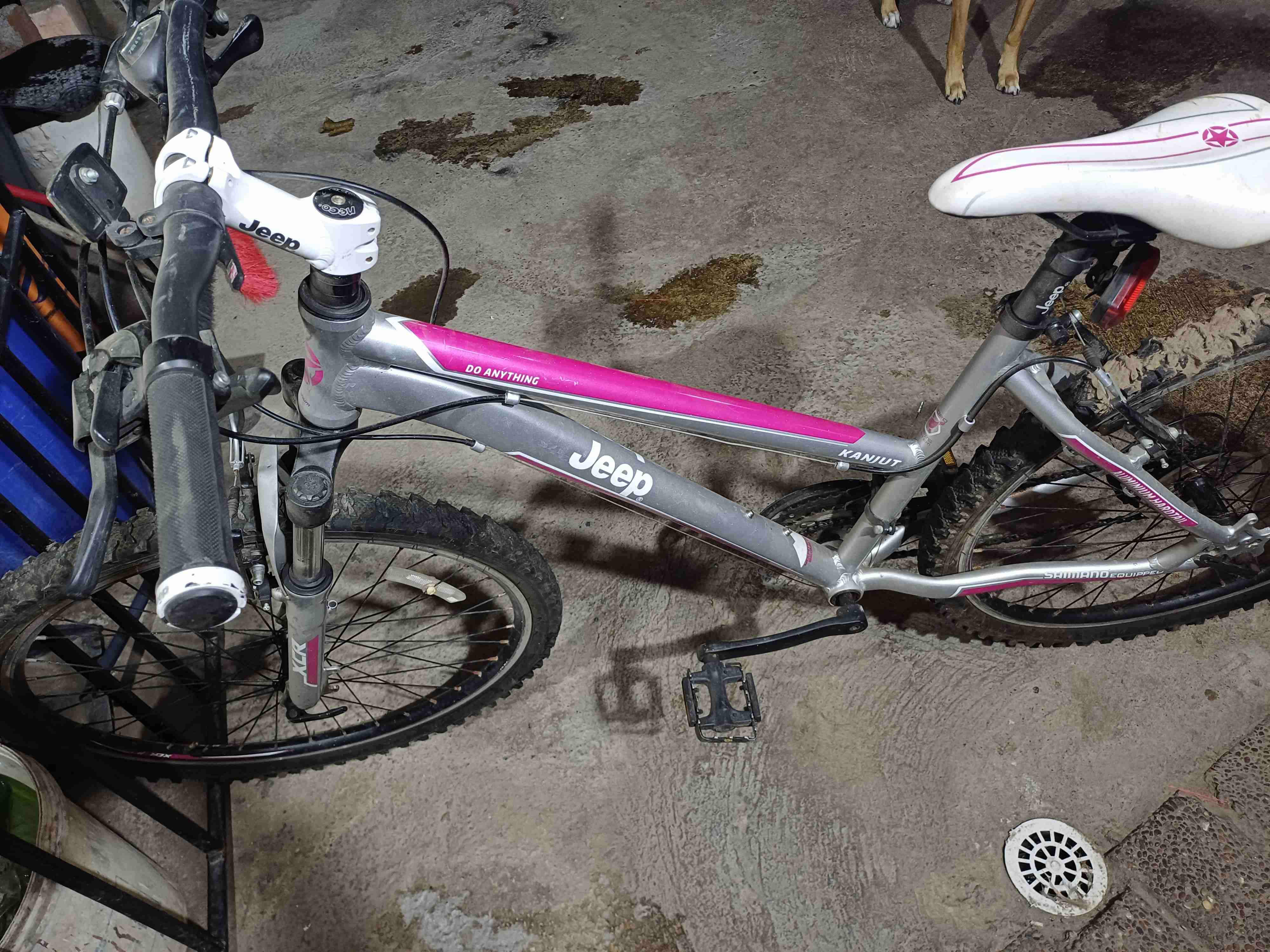 Bicicleta de montaña Jeep en buen estado, color gris y rosa. Ideal para aventuras al aire libre.