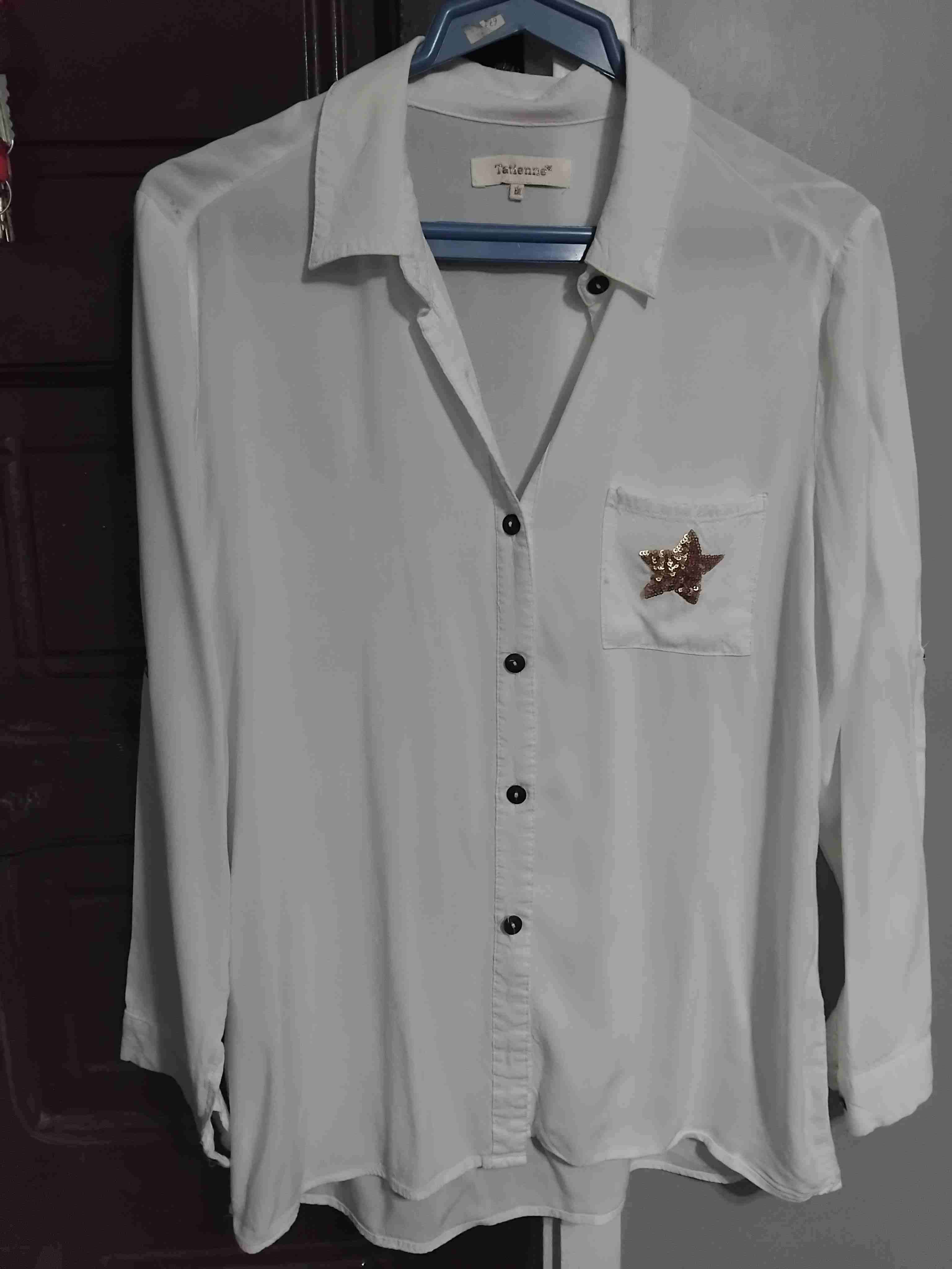 Blusa blanca elegante, detalle de estrella de lentejuelas en el bolsillo. Perfecta para ocasiones formales o casuales.