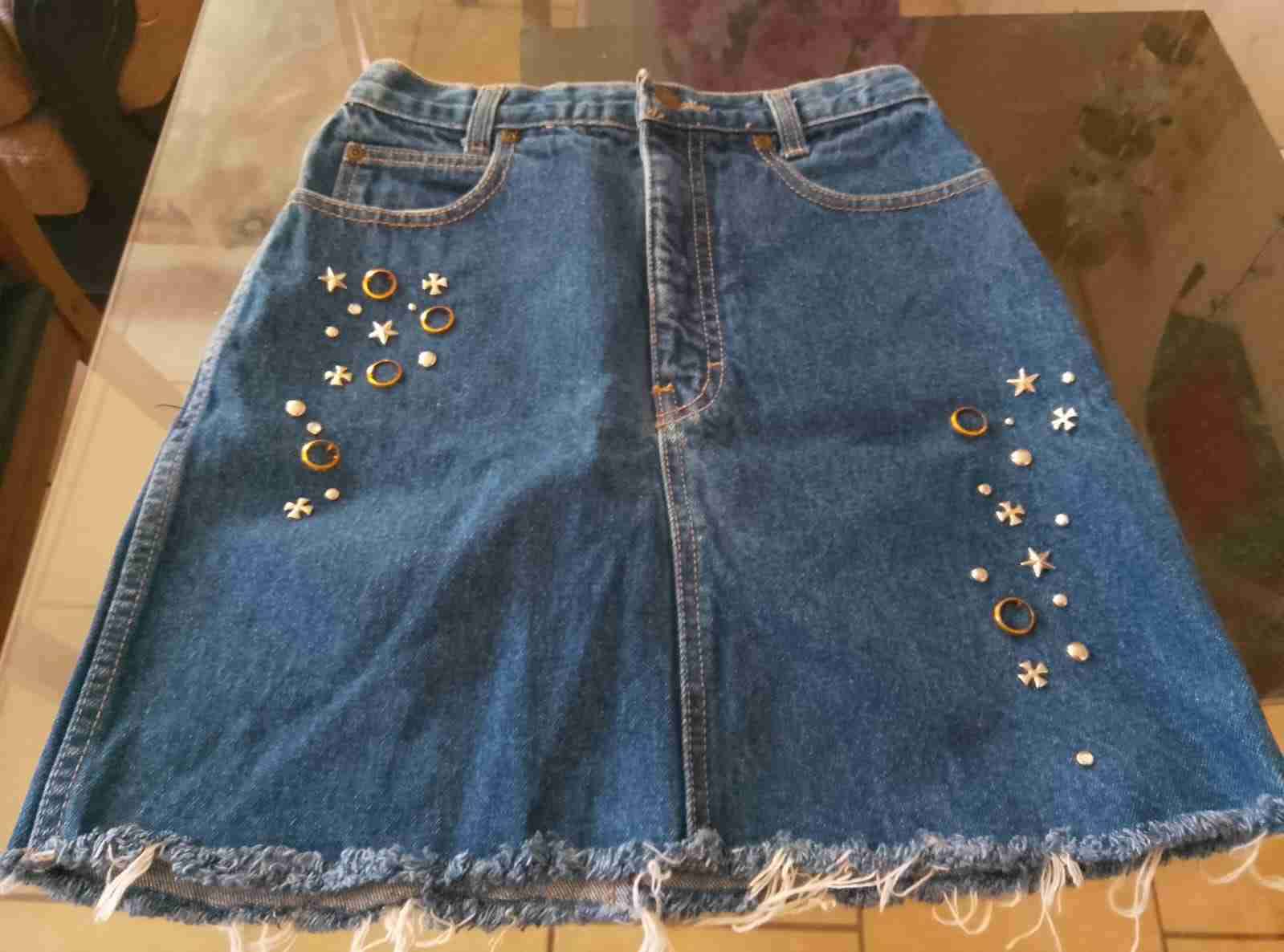 Falda de mezclilla con apliques dorados y plateados, estilo casual y juvenil.